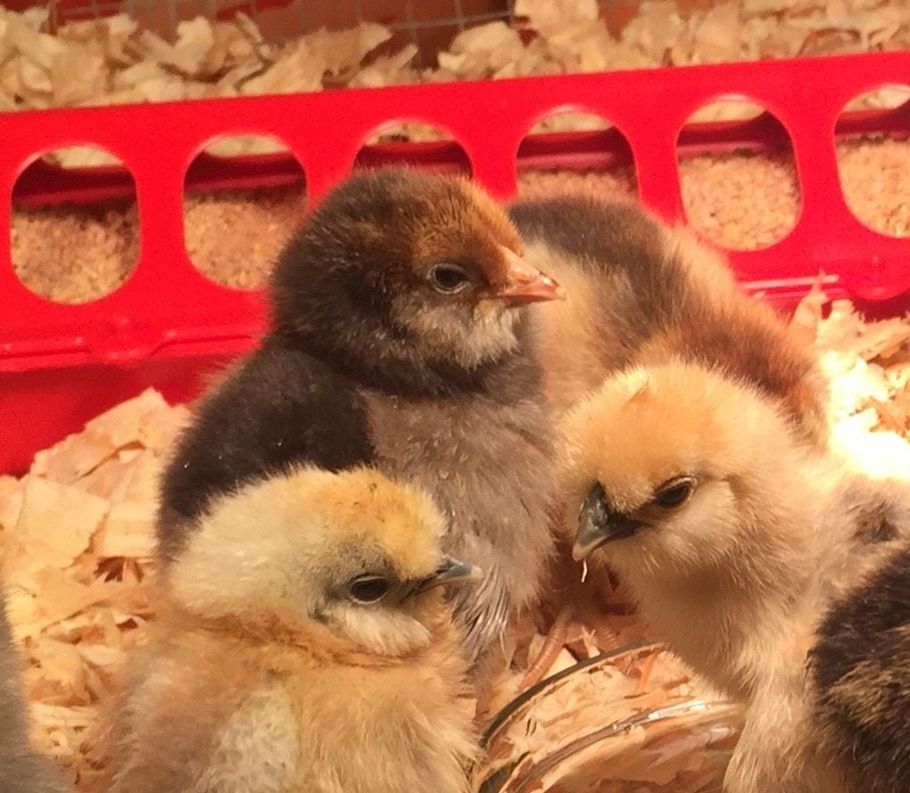 I've been suspicious of Peggy Olson for awhile now, and with the recent appearance of golden saddle feathers she's pretty definitely a he. He came in a group of 13 chicks we ordered from chickensforbackyards.com, he is almost 3 months old. The original order consisted of 11 chicks, but they added a couple of extra. I was able to identify all the breeds we ordered plus one extra sikie and Peggy, who I assumed was an EE (we hard ordered 4 of them). I assumed this since his coloring didn't match any of the other breeds we ordered. See a picture of him as a chick below, the one with the brown head and gray body.