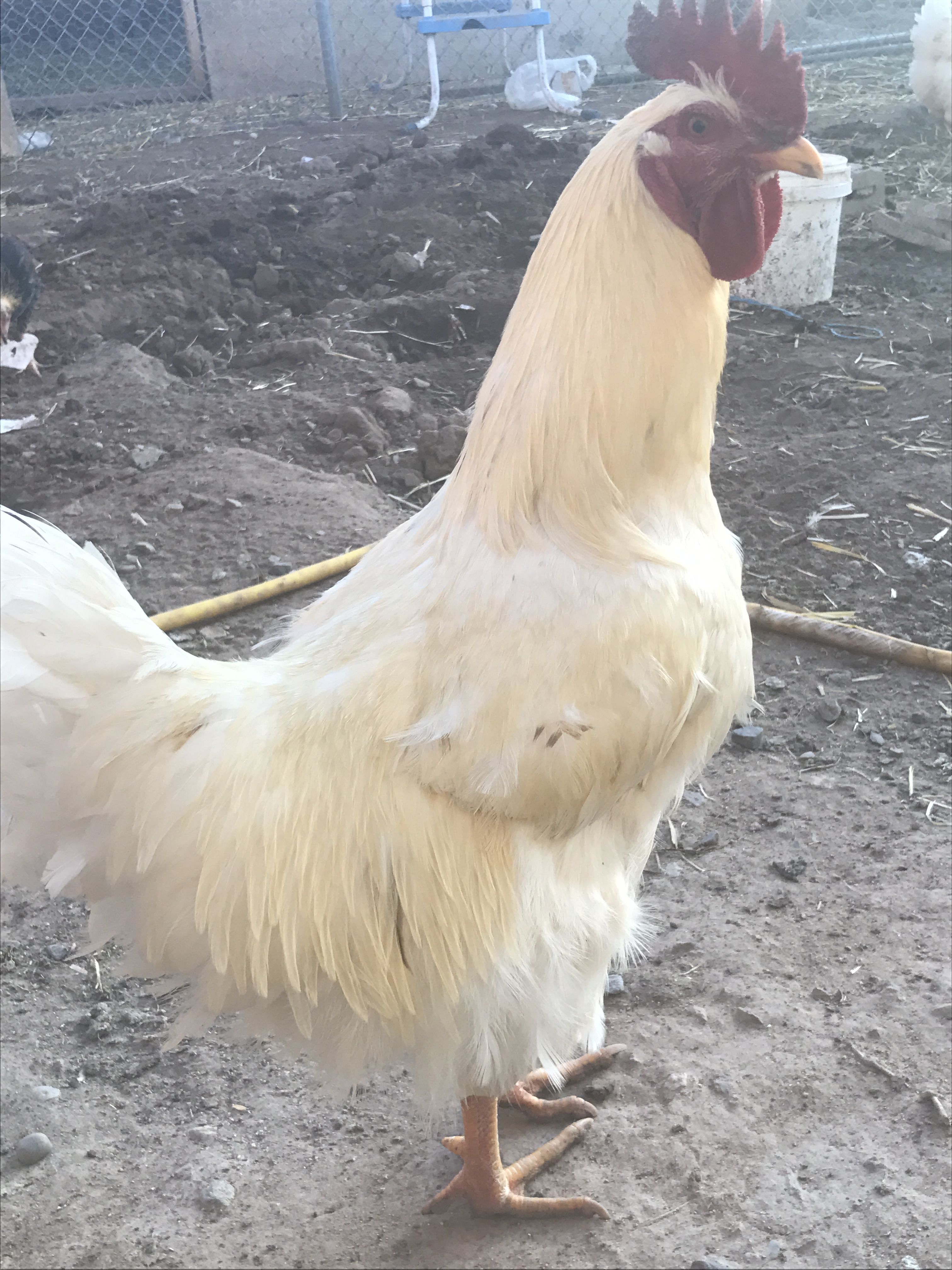 I'm new on here sorry if this sounds funny to y'all but I was wondering what breed my rooster is ? He's white and has yellowish feathers on top I also have a white one. With like brown spots and a little yellow on top as well I only have a picture of my main rooster