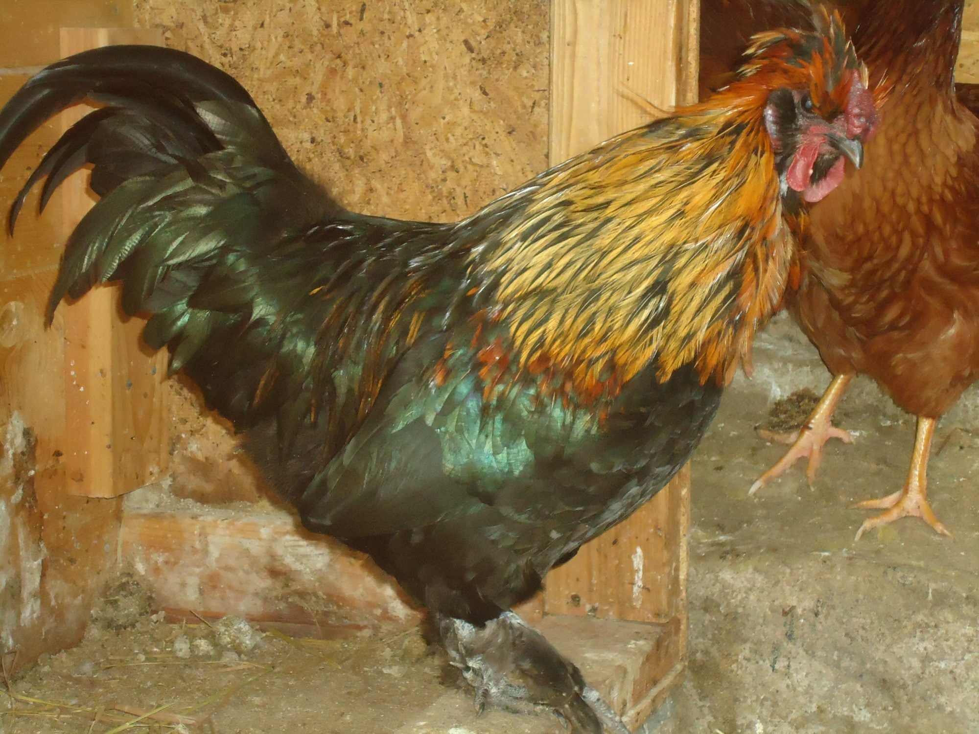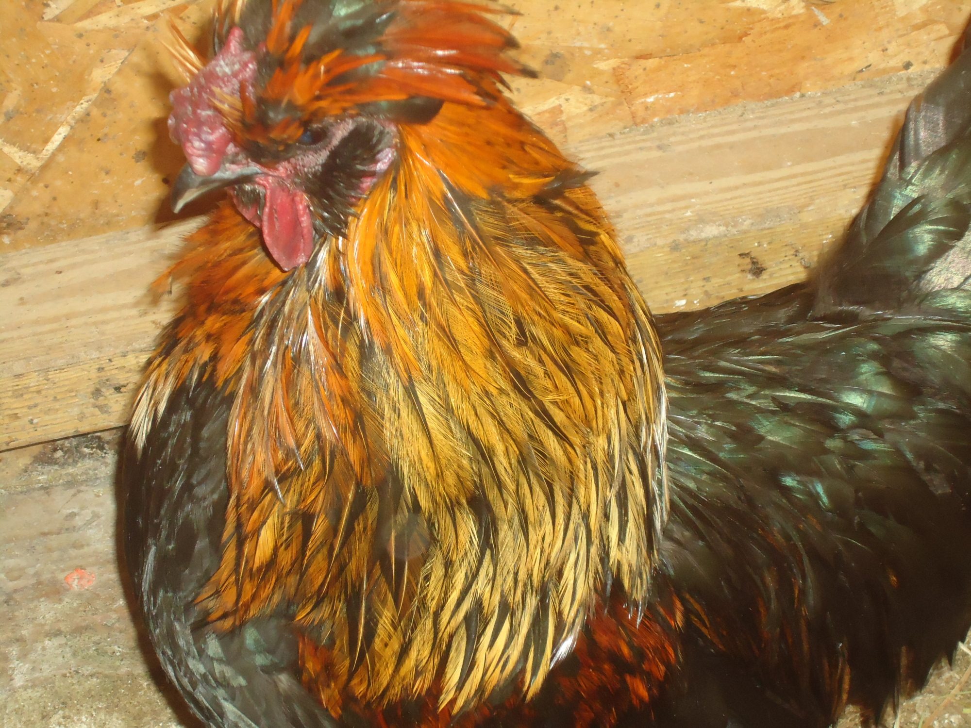 He looks a lot like polish/silkie crosses I've had. For some reason the roosters from silkie crosses end up with those vivid orange feathers, even if their parents had no red at all. These were a cross between black silkie/WCB polish.