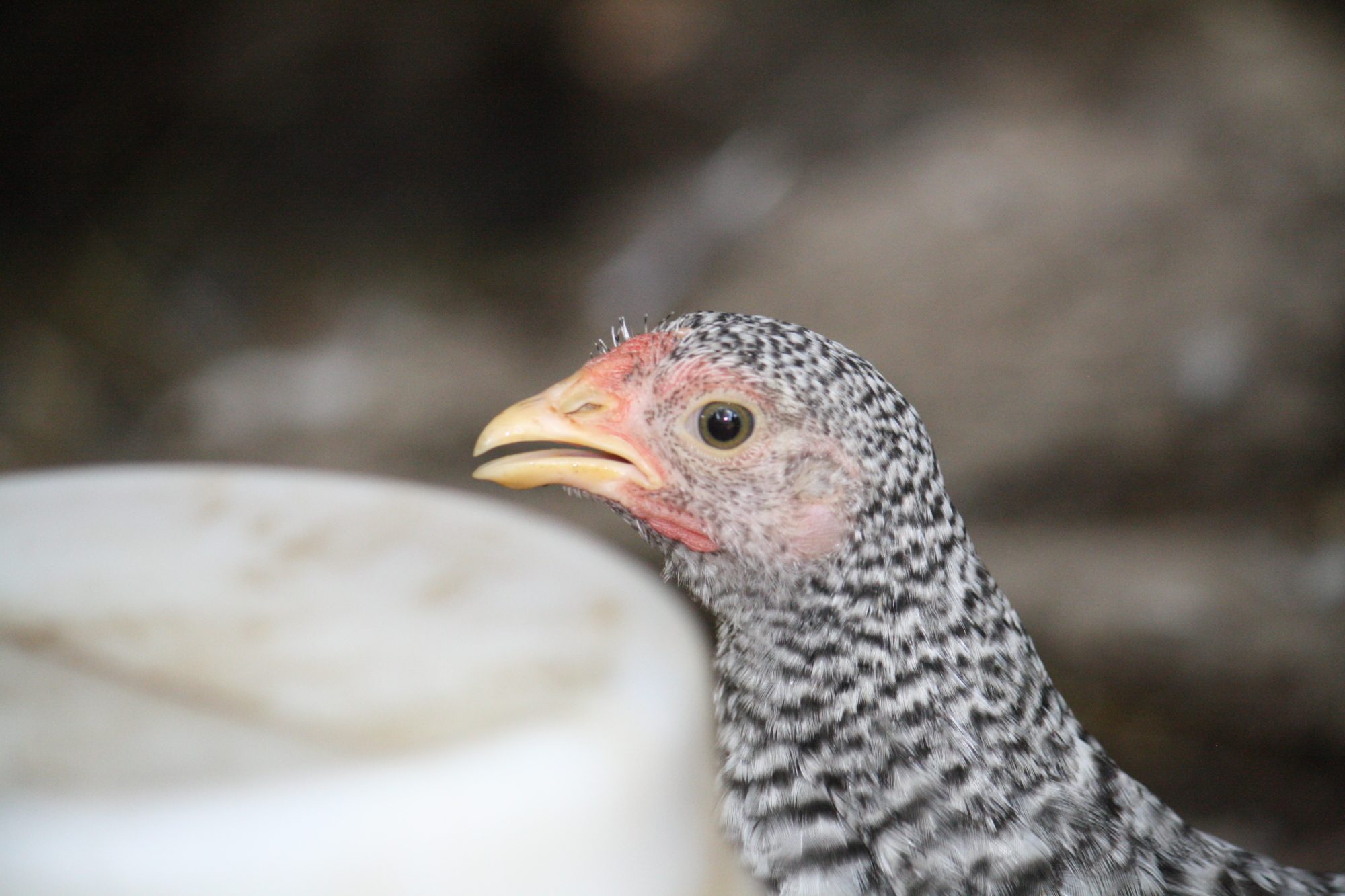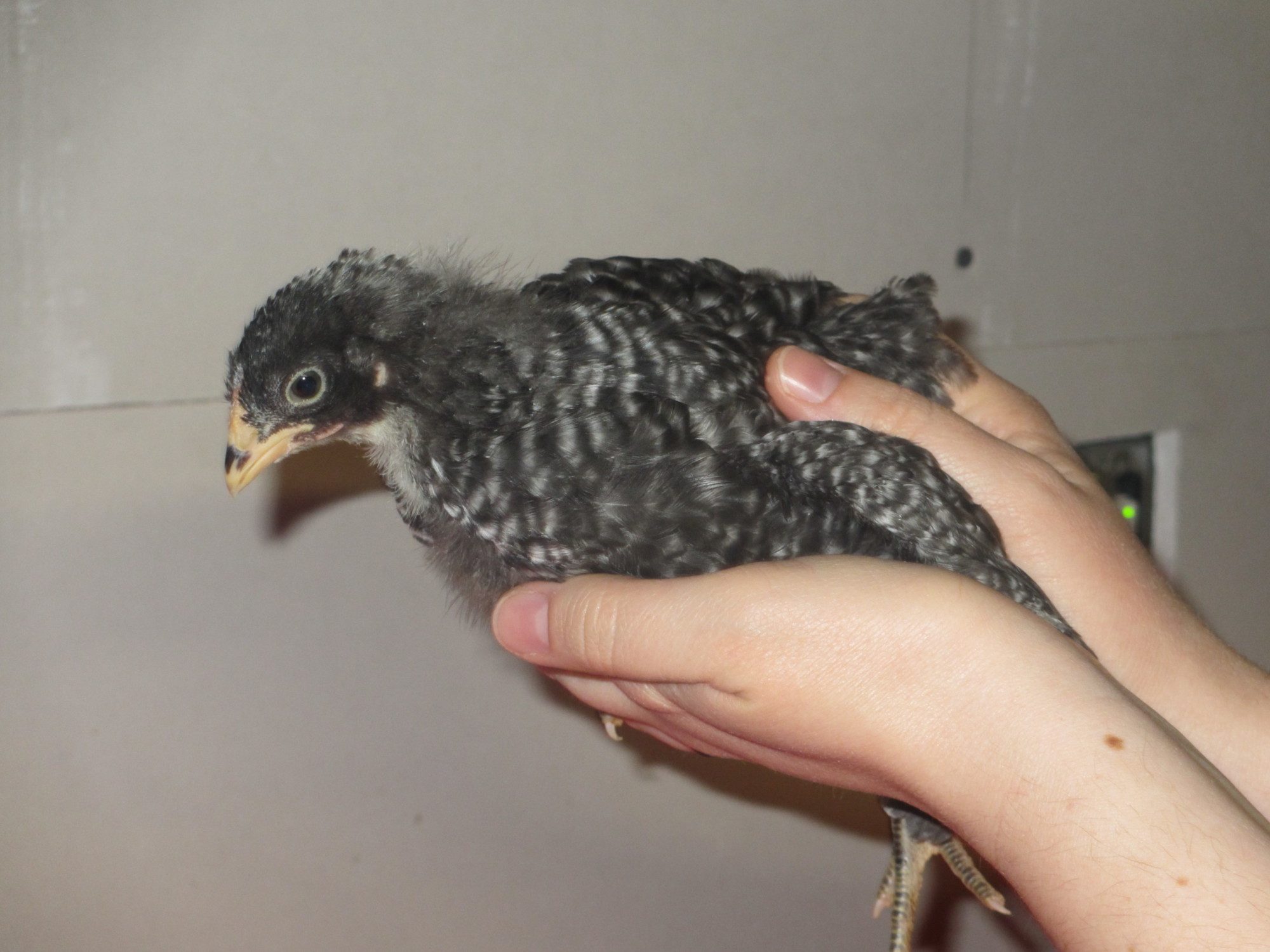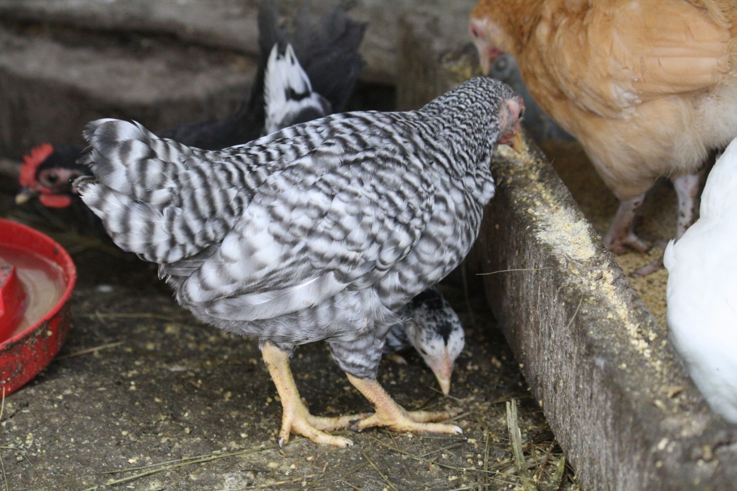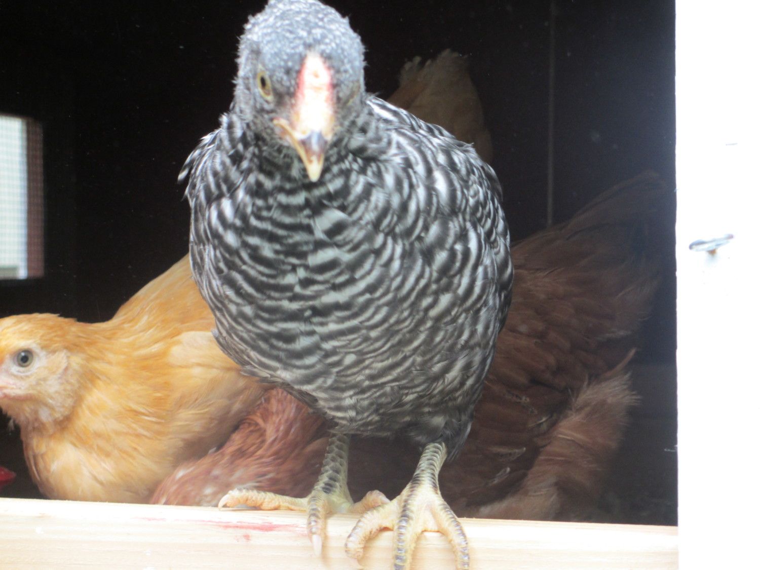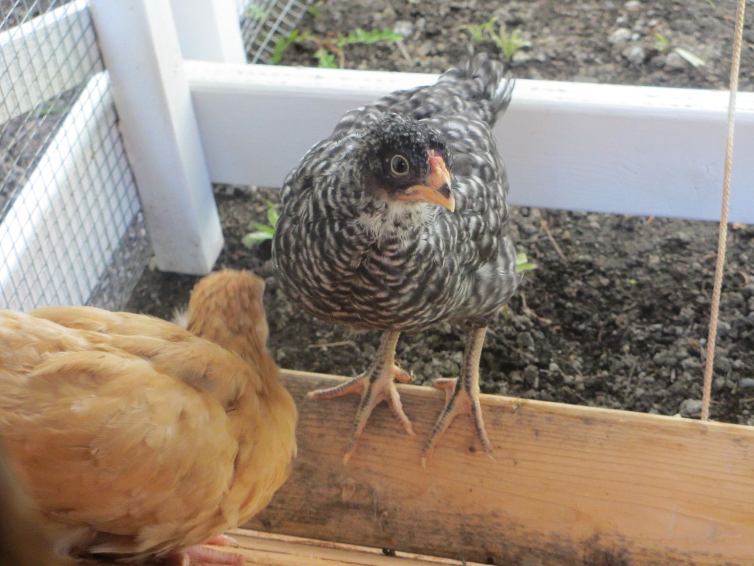 This chick is 6 weeks old. She was in the mixed bantam bin at the mill when I got her. I thought she was a bantam barred rock....but the comb isn't coming right. She wouldn't let me catch her this morning, so I had to make do with taking pictures from a distance. Any ideas?