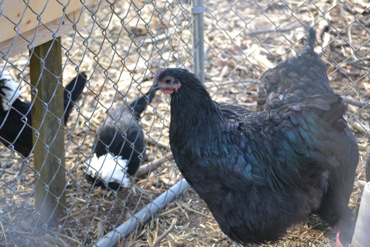 I got this hen as a day old mix chick. She looks a lot like my black copper marans but with no copper and a darker eye colour. For some resin she lays eggs the size of a silkie... I really like her for a mix breed bird with her pretty beetle green/blue colouring but with the size of her eggs I think I'm going to re home her. Any ideas what breeds she could be?