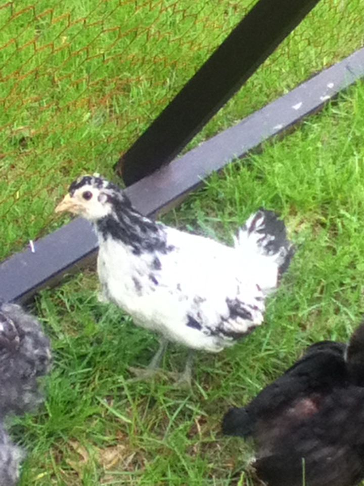 This is my chick tartar sauce. I got her at an auction in a box marked "assorted rare breed chicks". She came with a few other chickens, mostly cochins, and is kind of the oddball of the group. I think she is about 2 months old. She has kind of greenish colored legs .