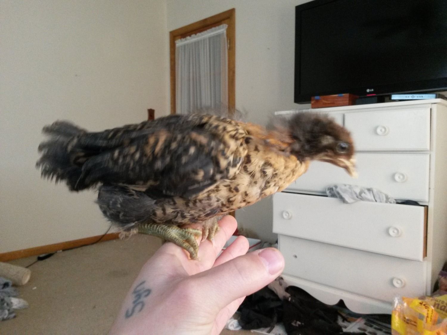 I picked up some heritage RIR's and some barred rock chicks a couple weeks ago from my local feed store but one of the barred rocks is definitely not a barred rock. I went to the feed store today with pictures and they are clueless as to what she could be. Maybe you all may have some clues??