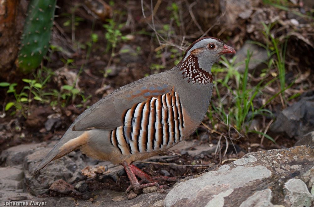 Look up a barbary partridge and see if that looks like what you saw. They have very similar markings though they have a black with white speckled necklace. Or perhaps it was another type of partridge considering it had no topknot? I love a mystery - hope you solve it.