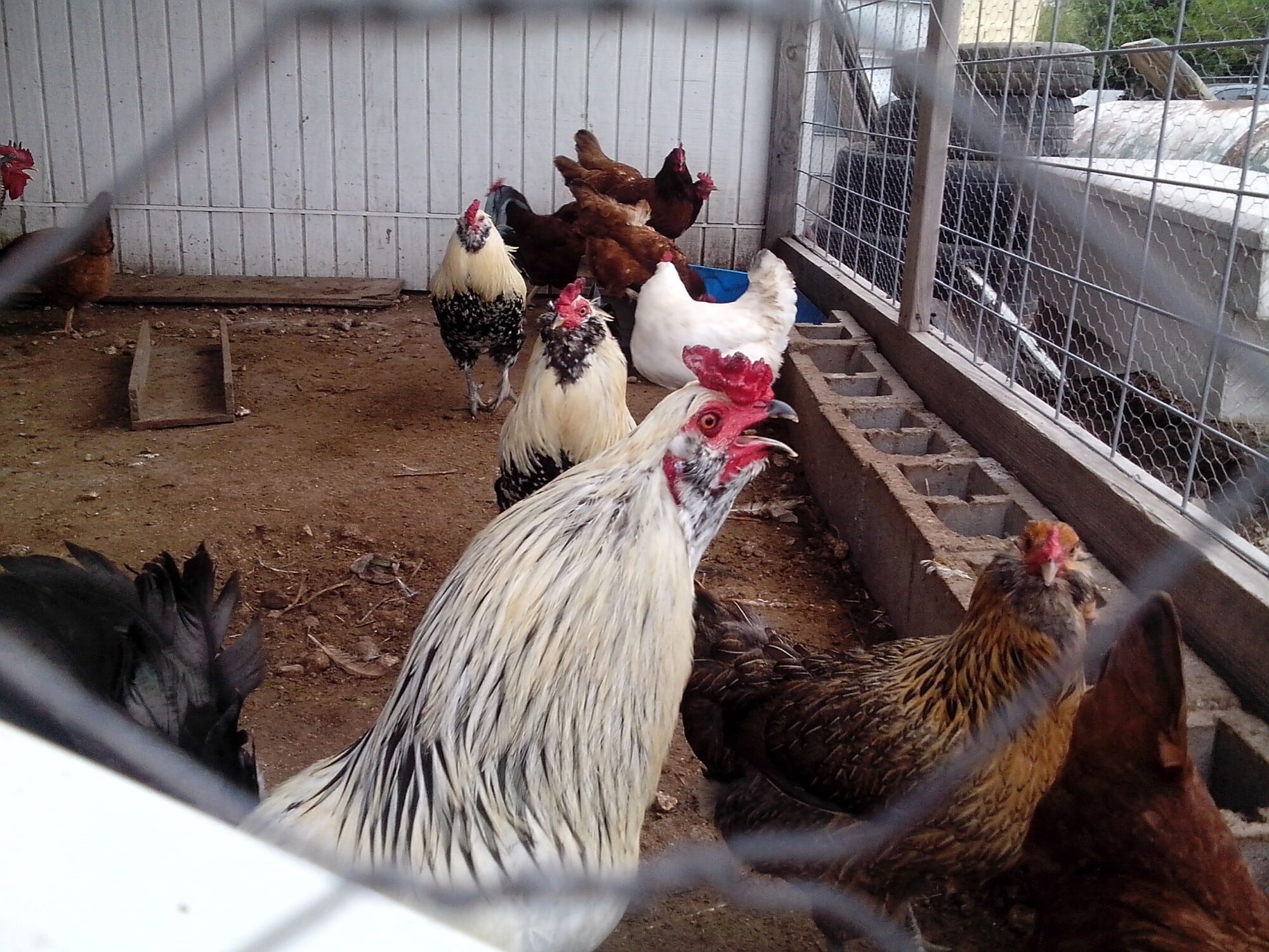 In the last picture, the roosters are Easter Eggers. The brown hen in the front is an Easter Egger. The red hens in the back look like Rhode Island Reds. The white hen might be a White Rock.