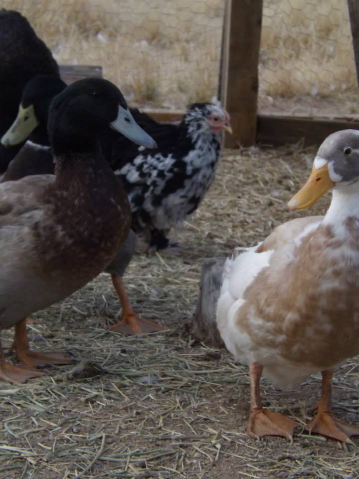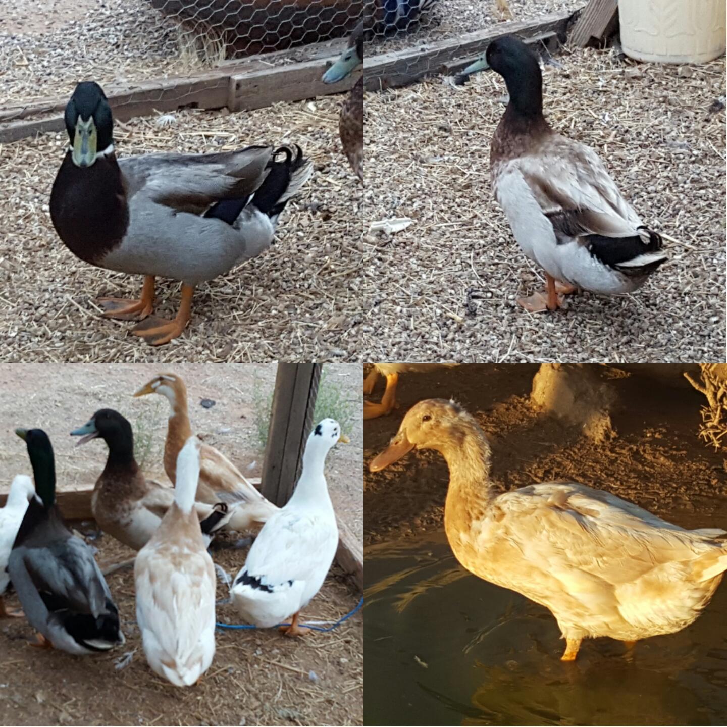 2 welsh Harlequin drakes on the top. 1 buff hen in the bottom right hand corner. I don't no what the middle one in the bottom left corner is. But the almost all white I have never seen