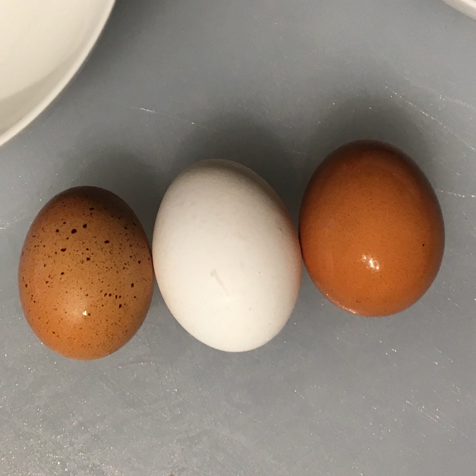 The white egg is a store bought egg to show size of the pullet eggs right now. But 1 brown egg is solid, and the other has speckles. Any ideas on if it's the same hen?