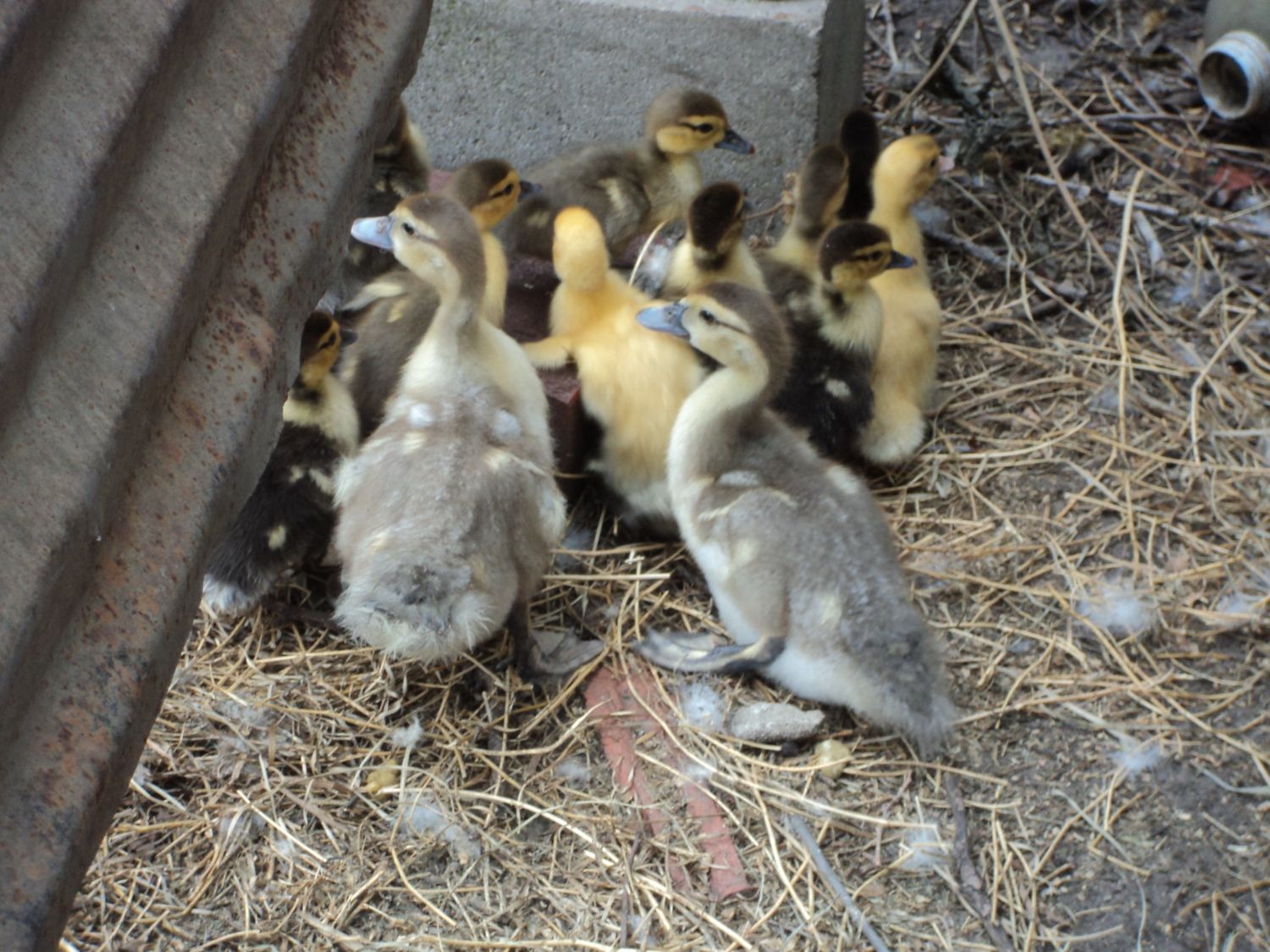 The two big ones up front looked dark when born, but now they look like they are turning grey? but I know they were not born as dark as the smaller ones. Even with them I am having a hard time, because the little front lefty is very dark, yet the guy in front of the brick in the back of the group isn't nearly as dark. I don't know who is the mamma & poppa either. Females are white, & black/white, the drakes-one is white-- had some brown but it faded away, & also a blueish lilac solid.