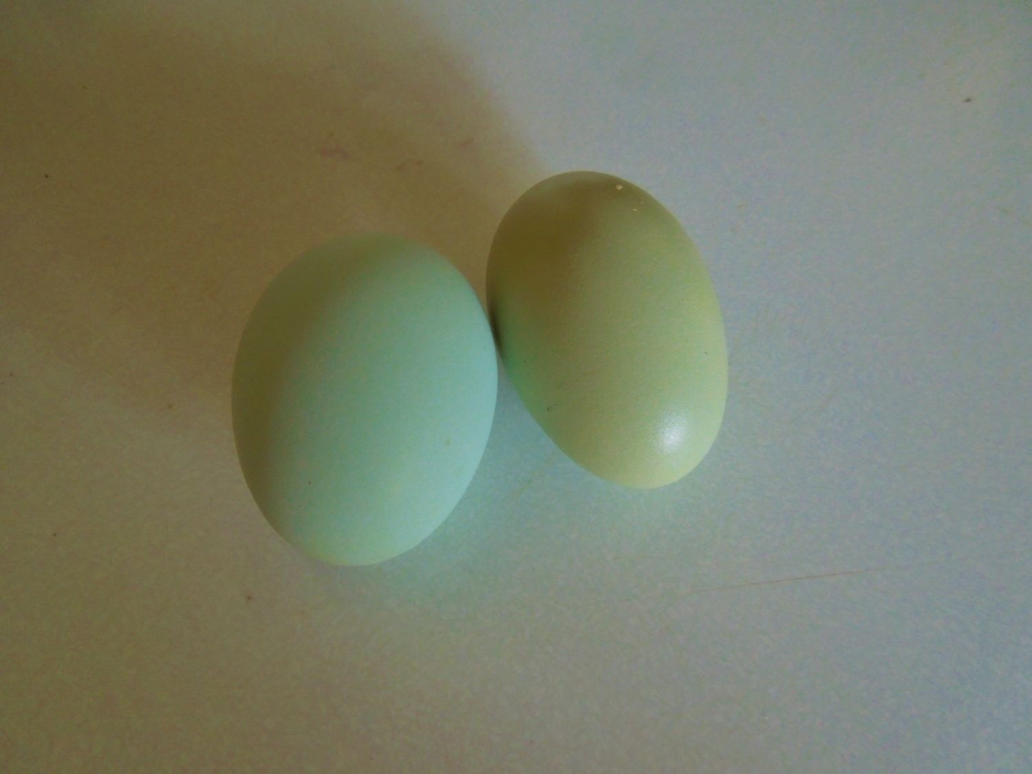 Above: An olive-green EE egg along with a blue egg from our Cream Legbar for comparison. We might have an EE who lays blue, but her first couple eggs haven't exactly revealed specifically what color they'll be.