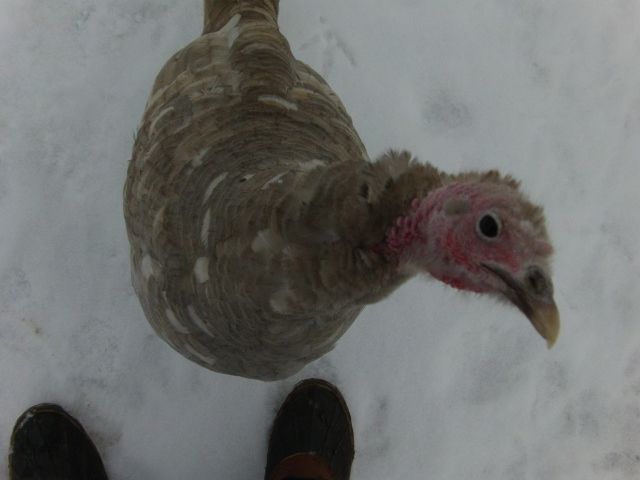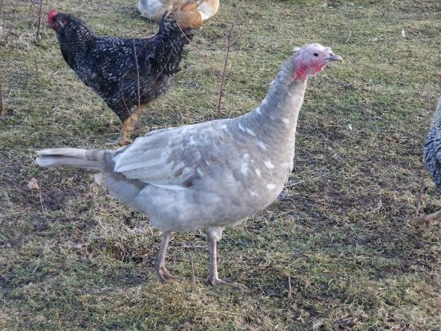 So, we have this sweet little hen we got from our local feed store last spring. I've posted pictures of her before to try and find out what she might have in her. To me, she looks slatey but I know nothing of turkey genetics to be sure if that actually means something. She's not very big, only about 10-12lbs close to the same size as my Blue Palm hen and smaller than our Narrie/Palm cross. She's got a real reddish/rusty tinge to her feathering with random white feathers (as you can see) her tail marking doesn't have a real pattern to it either, some have barring at the end others are solid. Also her flight feathers are quite pale. Any ideas?