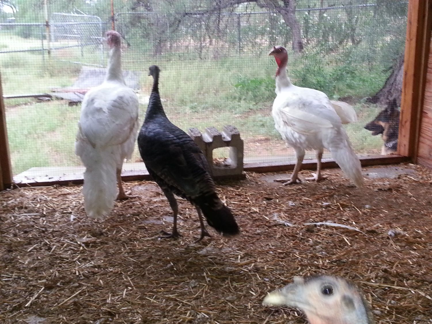 I am mostly a chicken person, so I'd greatly appreciate some help from a turkey person. For the last two years I have raised some Double-Breasted White Turkeys that have turned out VERY large. Those are the only turkeys I have any knowledge/experience of/with. This year I only managed to get two DBW turkeys, I wanted six. Today I went to the feed store. They had two "5 month old toms" (no further info) someone had sold them, that they had been feeding for a month and really wanted to get rid of. They knew I had wanted more turkeys and made me an offer I couldn't refuse. So now I would like to figure out what breed(s) they are, how old they actually are, and verify they are both toms. Looking on line, they might be Heritage (standard) Bronze, Eastern Wild, or Narragansett, but I'm not sure which. The bigger one with lighter wings I am calling Cranberry and the other one is Sweet Potato. The DB Whites are Stuffing (bigger) and Gravy.