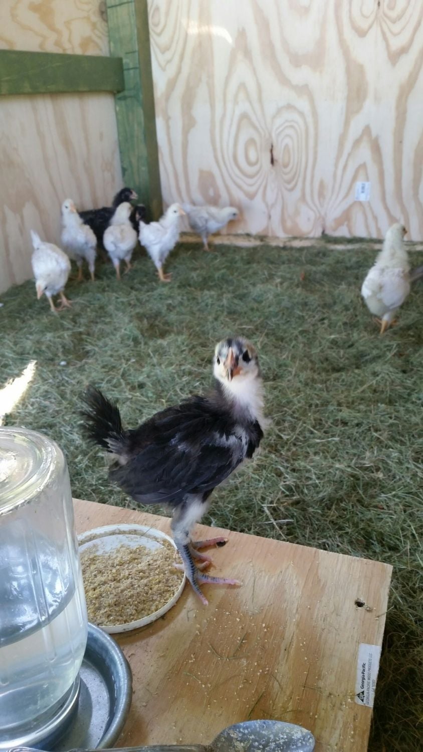I was supposed to get 6 California whites and 6 barred rocks. You can see that this little gem is neither. They're 3 weeks old tomorrow and the last few days it has become obvious that she's not a barred rock. When they were little yellow and gray fluff balls....who knew...lol.