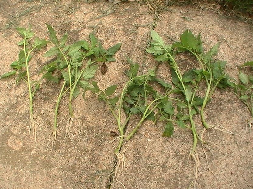 Planted these tomato cuttings . These are as large as the original plants . Nice roots after about 10 days . Pepper cuttings take much longer to root . Tilled some weeds . Picked some radishes . Had my break so time to go back out .