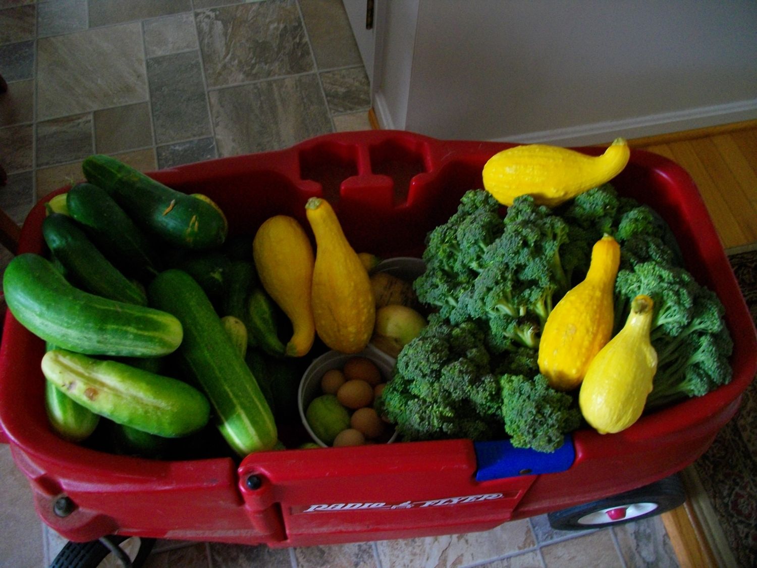 This was today's haul. Stuff is getting past prime/overgrown because I cannot keep up with picking and processing it all. Had to wheel the wagon right into the house, it was so full I didn't want to make that many trips in and out the door to empty it. Cucumbers, yellow squash, broccoli, kohlrabi, turnips and eggs (no, they weren't laid in the garden!)