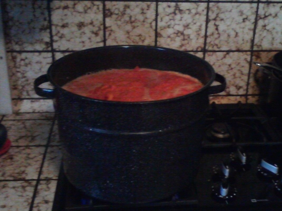 Out of the garden and into the kitchen.... Again! So, today we finally took the 20 lbs of garden tomatoes from the freezer and added those to the 5 lbs of romas and 8 lbs large tomatoes. It took 3 hours to blanch, peel and pureed them. We saved about 2 lbs of romas and just diced them up. We browned 2 lbs of lean ground beef and 2 lbs italian sausage and sauteed onions and garlic. Tomorrow we will cook it up. At the last minute we will add diced red and yellow onions, red and green peppers and some lemon basil and purple basil (all from the garden). I can't wait, because the house will smell amazing. Should get about 15ish pints...