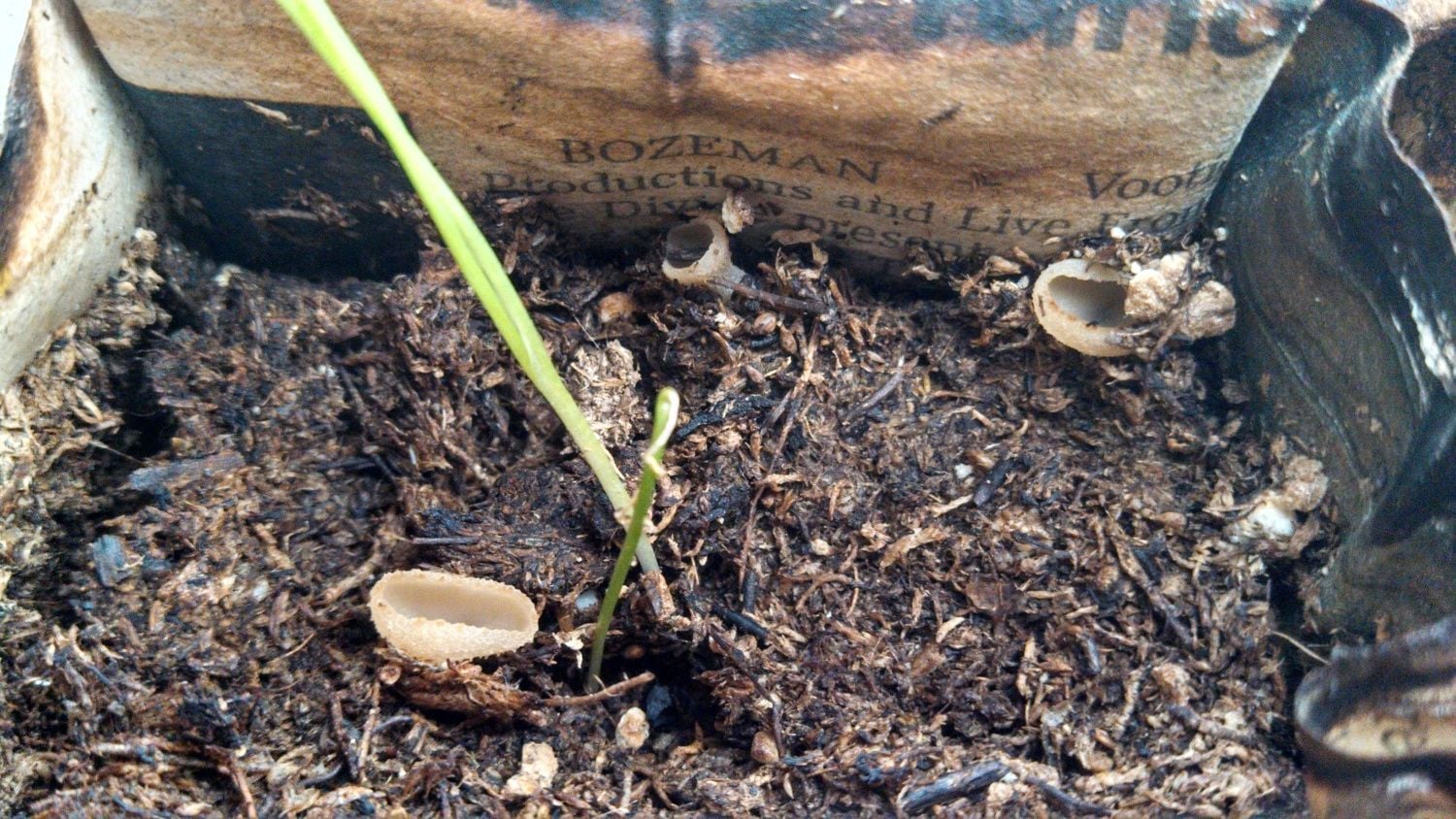 I was watering my onion seedlings and I found these tiny mushrooms growing in one of the folded newspaper pots. The odd thing is that I used a bagged soil mix, so I was surprised any spores found their way in, unless they were borne on the newspaper. Can anyone ID the fungus? Should I remove it or can I leave it for my own amusement?