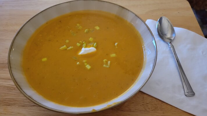 It dropped to 32°F last night and will again tonight, so it seemed like a good time to finally do something with one of the big-ol' butternut squashes I grew. So I oven-roasted it for an hour, made a brown butter with fresh sage and onion (both also from the garden) and combined them with a bunch of other goodies and...voila! Soup.