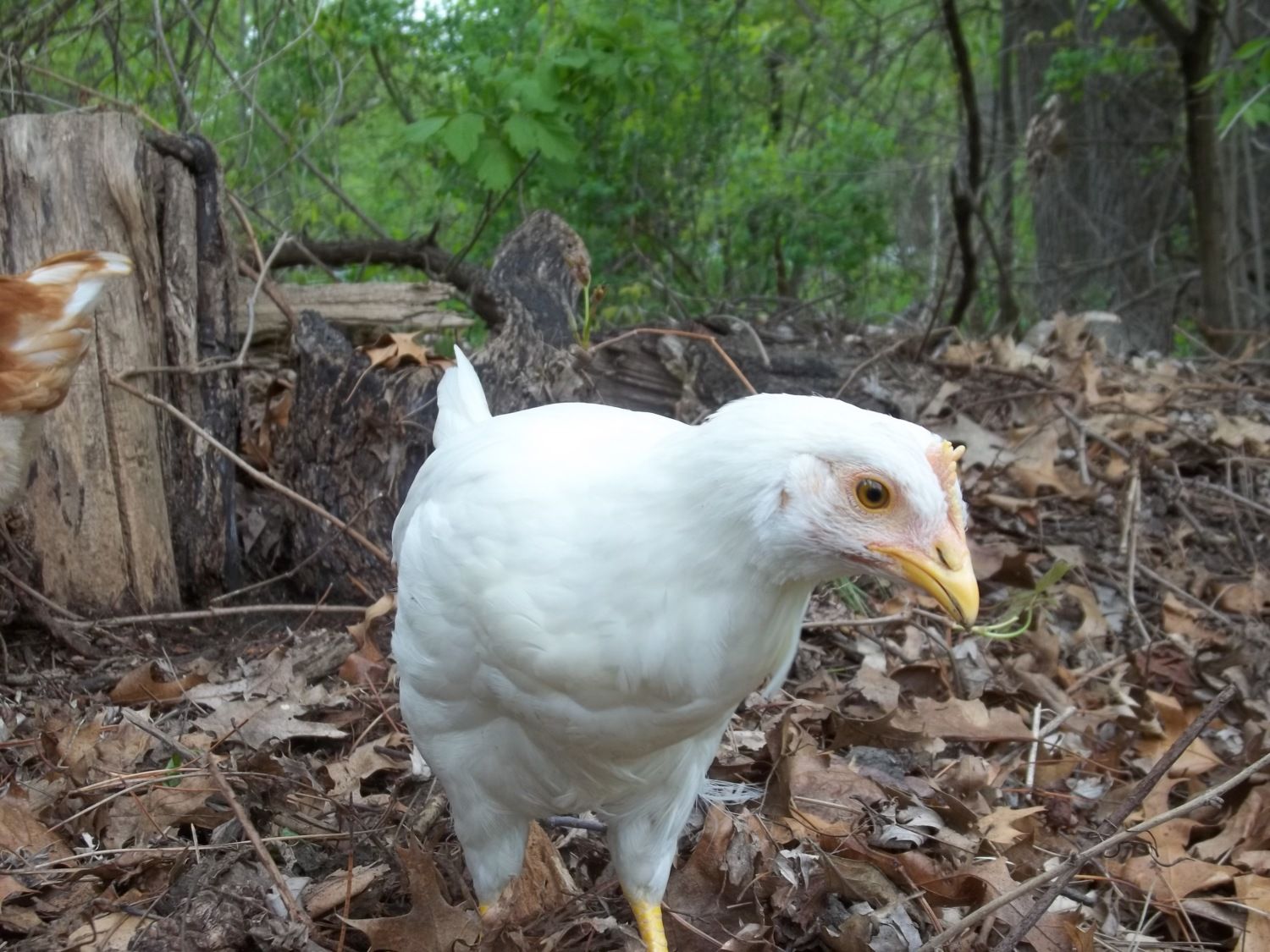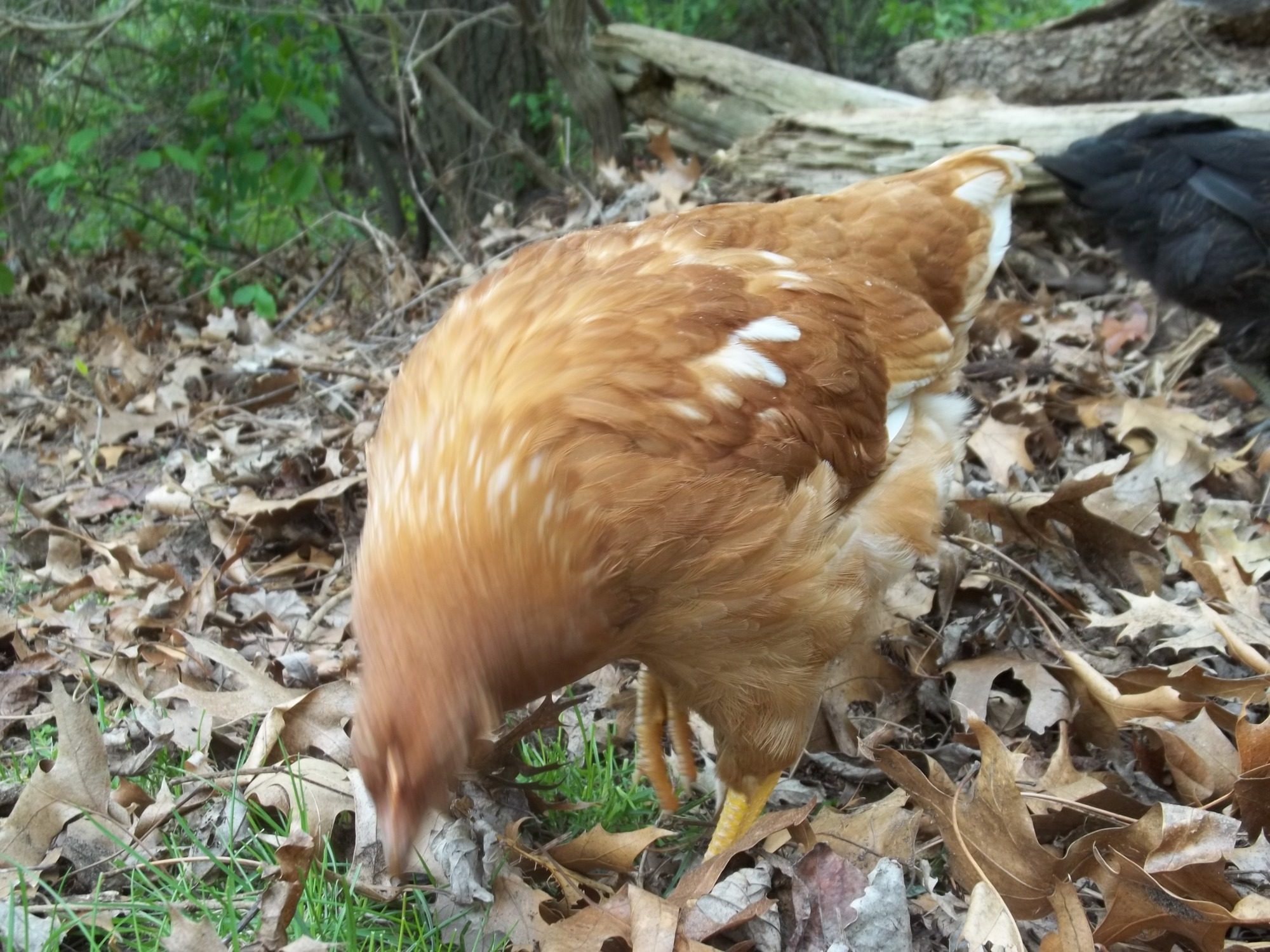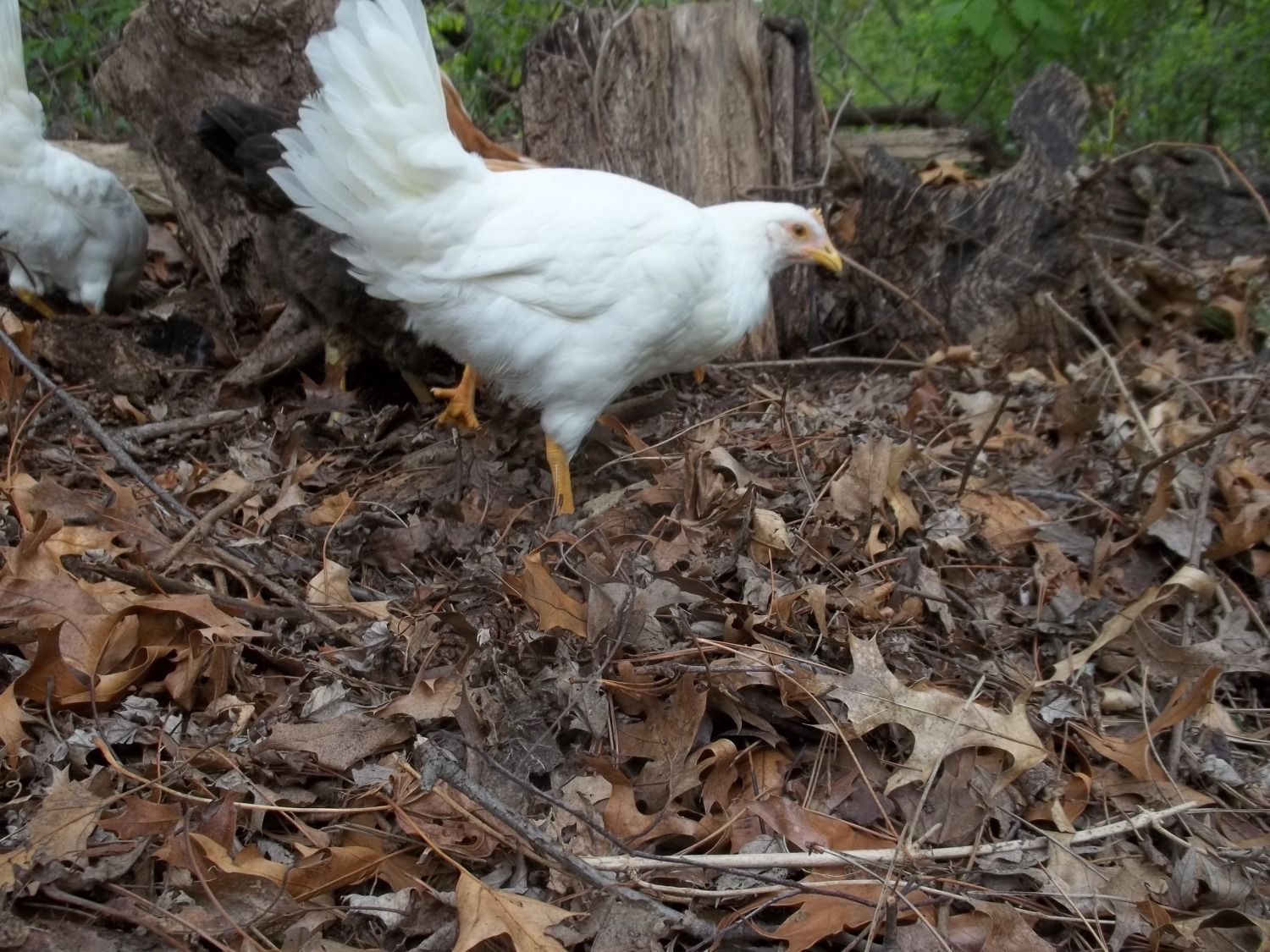 My girls had their third day of supervised work release and they worked their little hearts out foraging along the edge of the woods, turning oak leaves and scattering rotted wood to find their treats. On the first day of free range I set boundaries by waving a white towel in front of them when they reached a point beyond my comfort. The second day I had to use the towel less, and today they remained within three feet of the edge of the woods. We'll see how long it lasts.