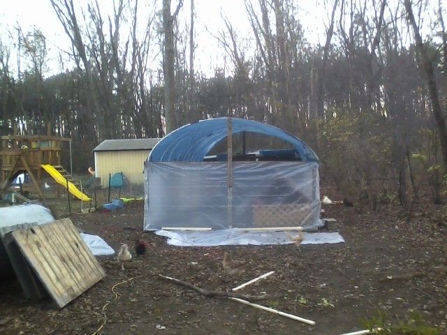 This is what I have been working on for my coops for the winter. The run is only 5 feet high. I put together 15 foot pvc poles, spaced them 18 inches apart and anchored them to the runs top 2x4. They sell the anchors... I don't know what they are called, but it keeps the pipes close to the walls... Anyway, I used those, 2 on each end for firmness. Ran a 19 foot long pipe along the top, connected to the wood and weaved thru the hoops over and under to help keep the hoops straight. The tarp is a 16x20. It is zip tied and duct taped to the end poles. It is stapled to the runs top 2x4 and then there are wood furring strips over that as well to keep the wind from ripping it off. I have since taken this picture finished it. BUT, all in all, this is one investment I am very glad to have put up. We've had frost here every morning, the water has frozen on top every morning. BUT no frost in the fun run. LOL. I do not have to worry about locking the coops in the run at night now that there is a top on. There is fencing on the ends all the way up to the top of the hoops to keep out owls, hawks and coons. The run door locks from high up so coon hands can not open it. It is full of leaves, and I have leaves in bags in the garage to keep them happy in the winter. Will just turn in new leaves every few weeks. Now, my birds free range all day. BUT in the winter, they have a snow free and dry place to be. No heat either. I do use a small heat lamp that sits over the waterer to keep it thawed enough for drinking. It is clamped, tied, and the power cord is weaved through the fencing on the run to keep it from falling into the leaves in the run and starting a fire. ALWAYS ALWAYS secure any light you may have in a coop or run more than one way. Triple secure it.