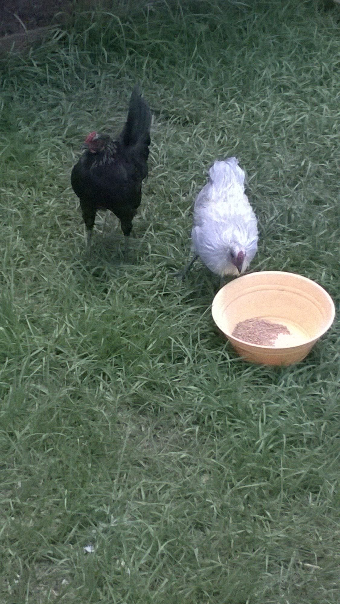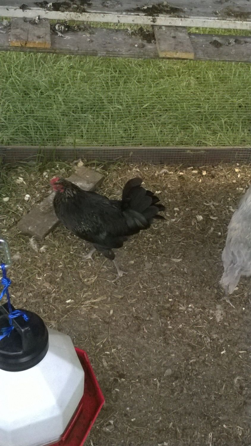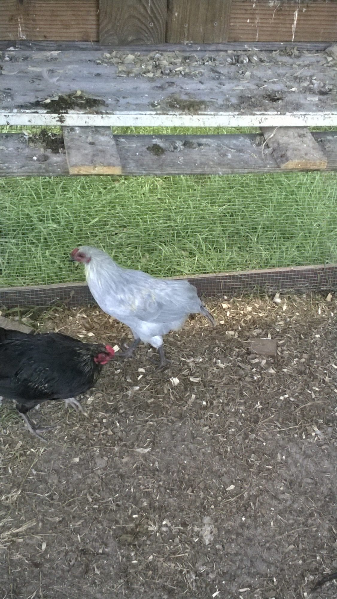 The black bird looks like a mixed breed, maybe with some Old English Game or Ameraucana. The lighter bird could be a Lavender Ameraucana or an Ameraucana mix.