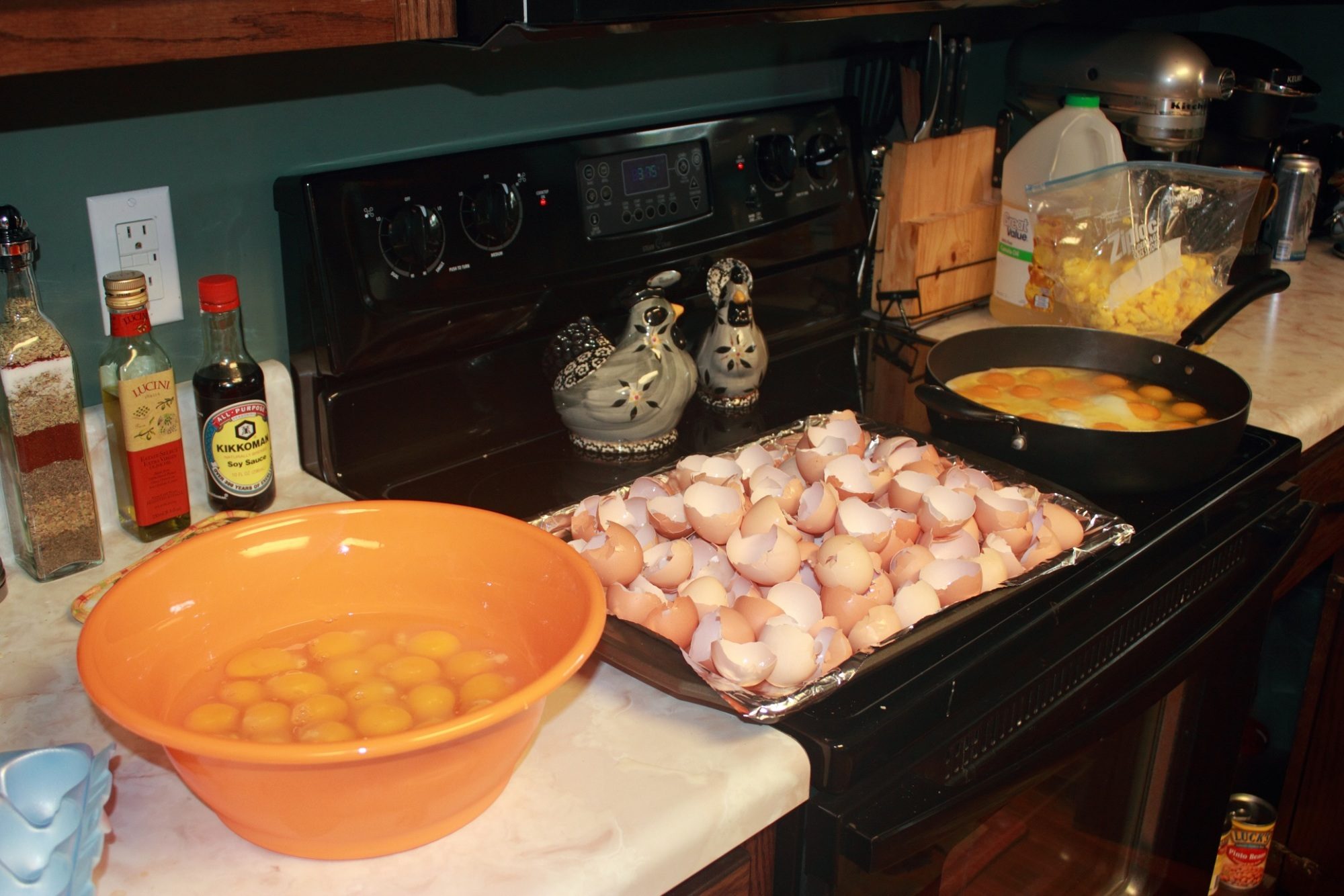 Usually, I wait until I have 6 or more dozen eggs so I can bake a big batch of shells, but I only scramble 2 dozen at a time (no more skillet room). I also bag and freeze the scrambled eggs in the batches. I use cooking oil to keep the eggs from not sticking instead of butter or margarine and I don't add salt or anything to the eggs.