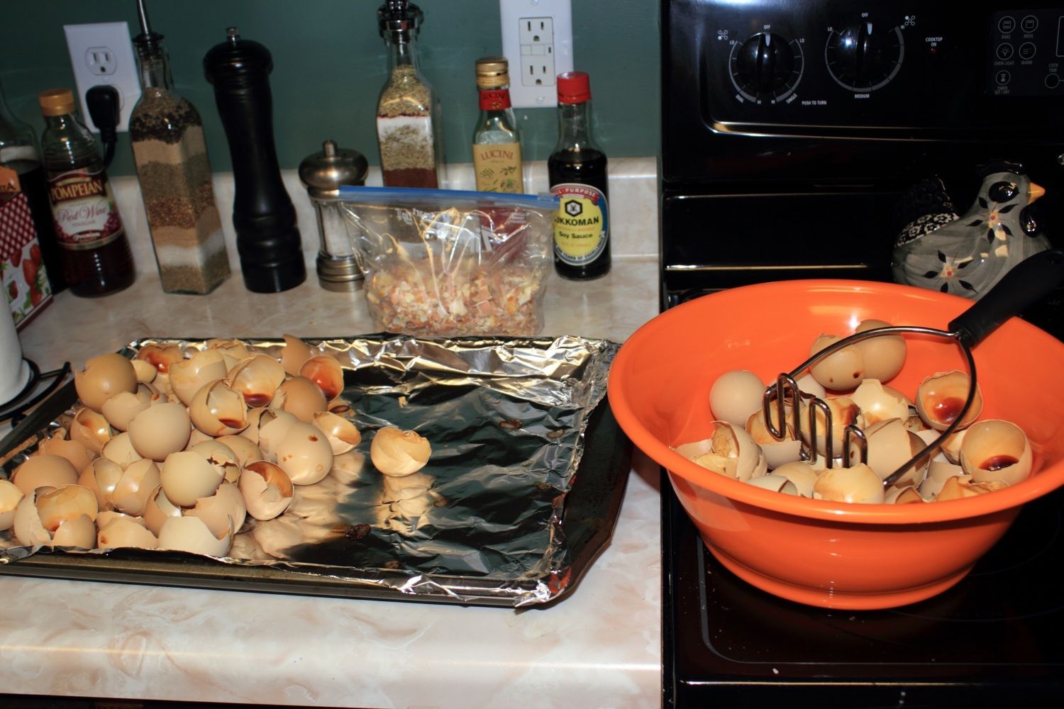 I bake the shell at 375 for about 20 minutes. After 20 minutes I shut the oven off but leave in the eggshells in there until I'm ready to crush them. I bag the 6 dozen crushed eggshells and freeze them until I need to use them. The quart size bag in this picture has 6 dozen crushed eggshells in it.