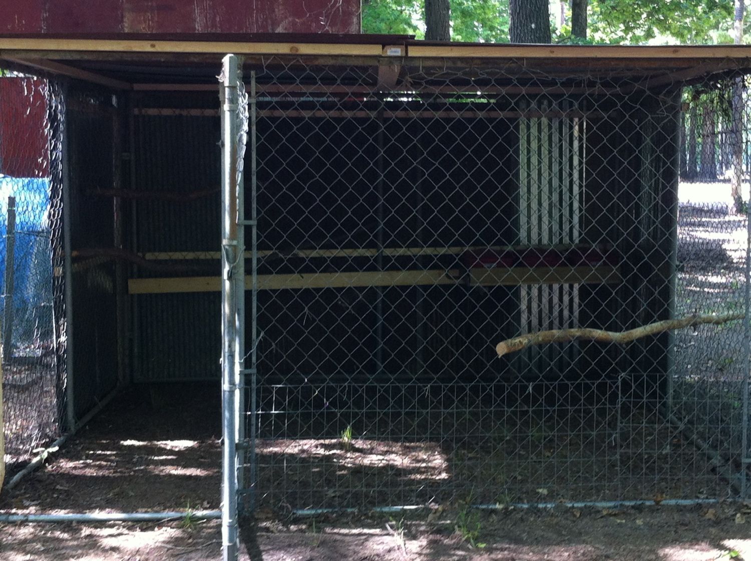 My 5 hens and 1 rooster are currently living in a 4x8 tractor. (They free range.) But it was hard to keep dry, and it was just a bit cramped. So, I changed a 10x10 chain link dog kennel into a new coop for them.