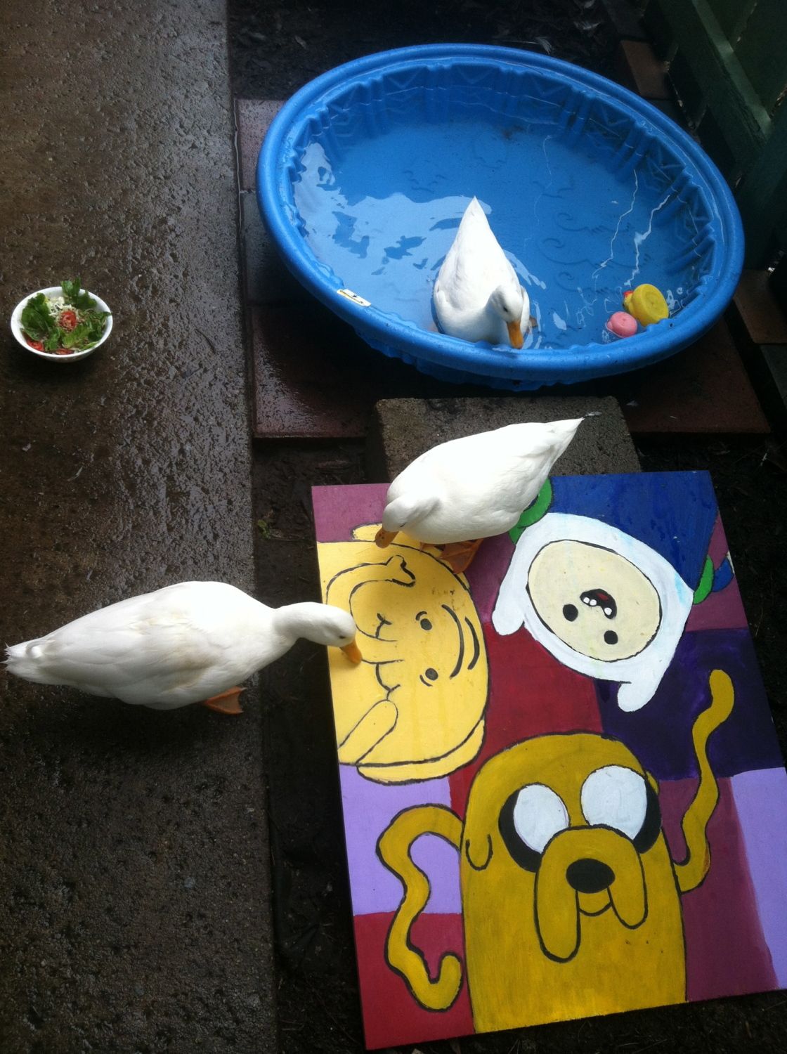 mine have a kiddie pool the largest one i could find at the time - one w a slide haha and yes they use the slide . but i have 3 - 9 week old pekins females and i just dont think its big enough..... they love to dive and its a freakin splash zone anywhere within 10 ft around it when they are in it because of their antics. maybe i should get 2? they are like 7 lbs each already and they wonlt get in by themselves.... ive tried teaching them and built them a ramp w logs and tried a step stool - NOPE they are lil divas. they look at the pool and bump it and Quack Honk at me till i put them in . then to get out . ive tried to put a stool in there but NO! they sometimes just flop out or they will step up in the slide part and Quack at me till i come get them... i totally