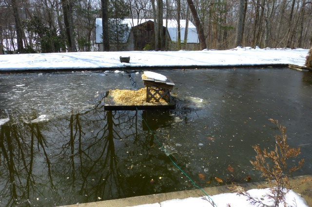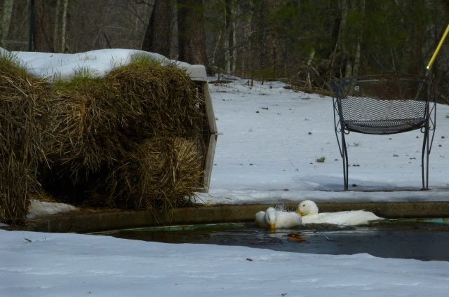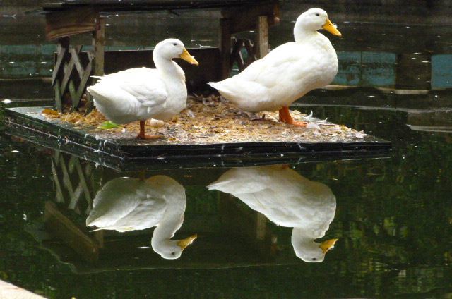 My ducks live on an old swimming pool, sharing it with bull frogs and koi. They have a floating duck house to protect them from predators. This Spring I will be adding a pen at one end of the pool and another duck house within the pen so that the floating house isn't their only option. Thus far they have seemed quite content and they lay eggs steadily. Once the pen is built I will add a drake.