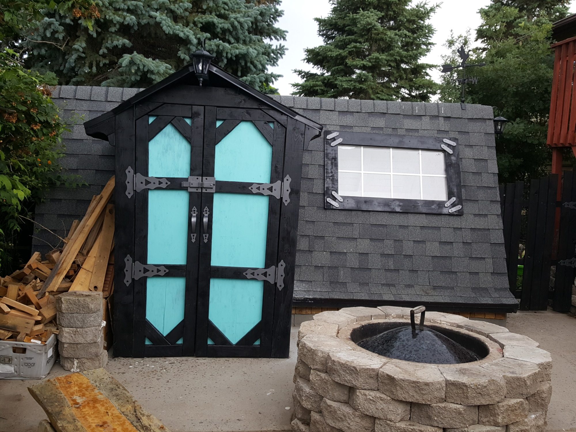 And a house made of 4 pallets screwed together to be almost a box, with fence panels screwed on the side.