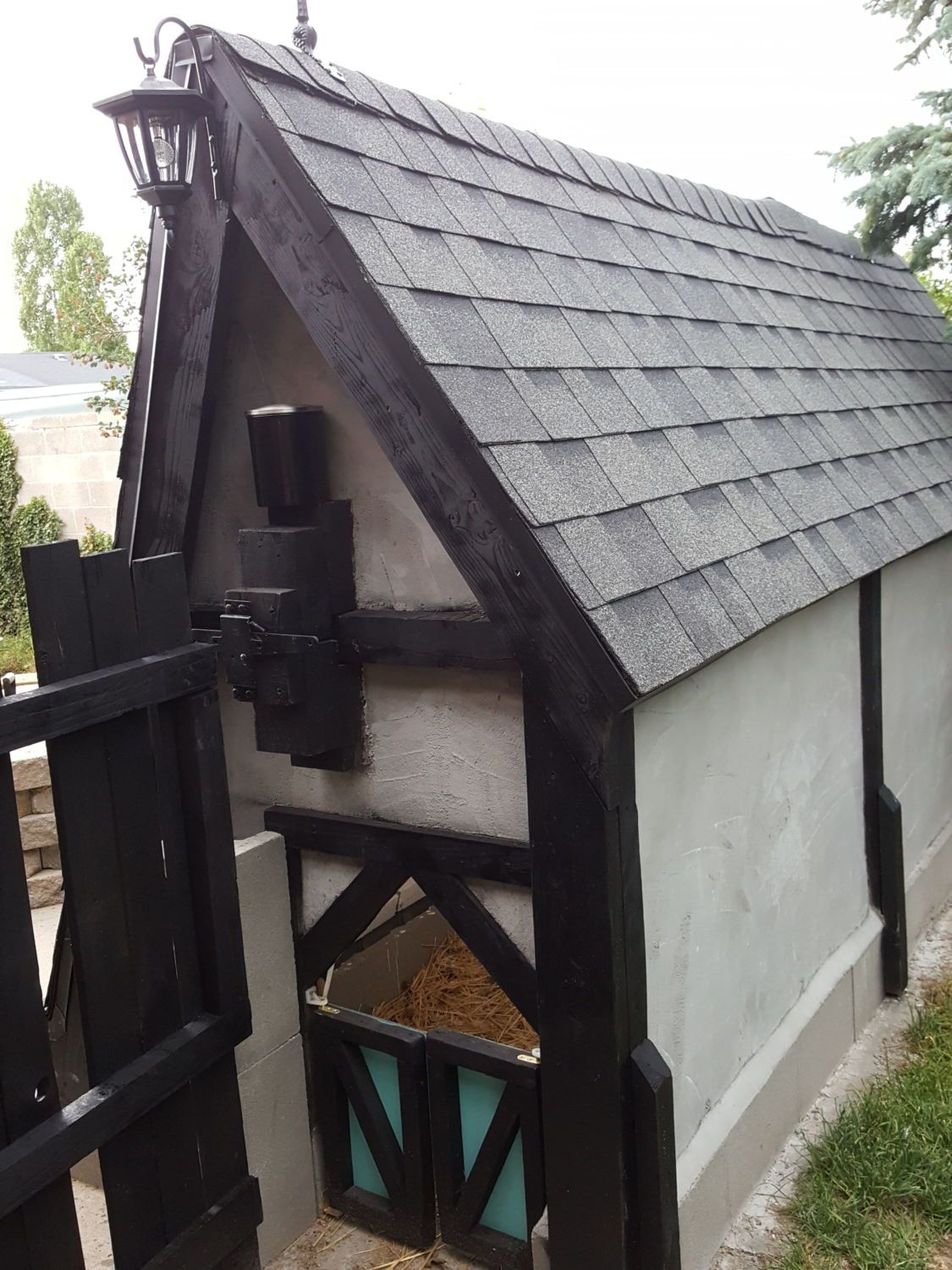 This is my Duck/Rooster House its made out of recycled pallets the most money we probably spent on it is actually the shingles i wanted it to be a fence and a house so my ducks get the grass and my dogs get the cement side of the yard... although my dog can open the gate... but he doesn't eat the bird poop all the time so that's ok