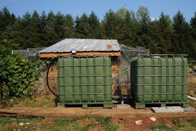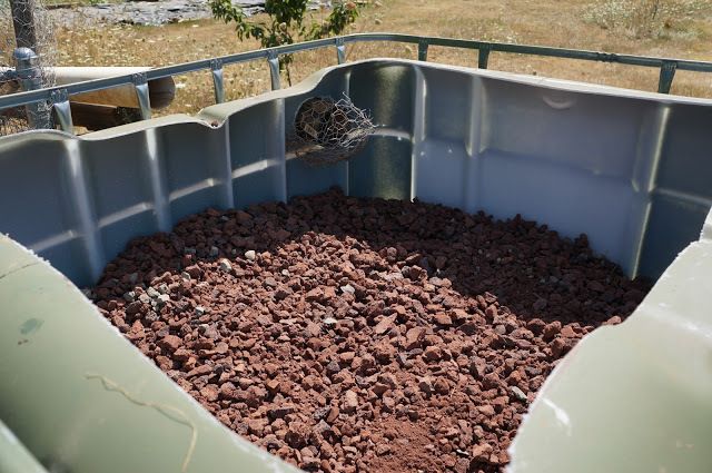 We have two large containers, approx 250gallons each. One is filled halfway with lava rocks(this is the first) and the other is filled closer to the top(this is the second).
