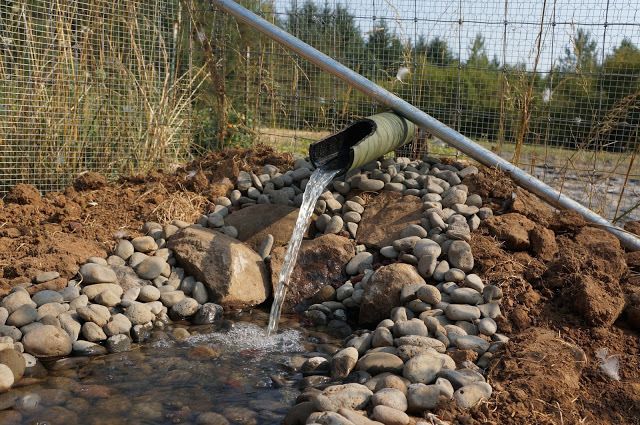 The water is pumped from the pond into the first container, then flows into the second container, then goes through some piping, past a UV light and back to a small stream we made that goes back to the pond.