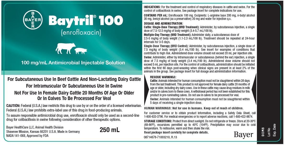 It's not allowed in poultry, true, but it can be used per the label in cattle and swine.Baytril and other fluoroquinolone antibiotics are on the list of drugs to NEVER give to poultry, because of the issues with drug resistant bacteria and human health. Look it up on the FARAD.org site. It's a great drug for dogs and cats, but not for food animals. Mary