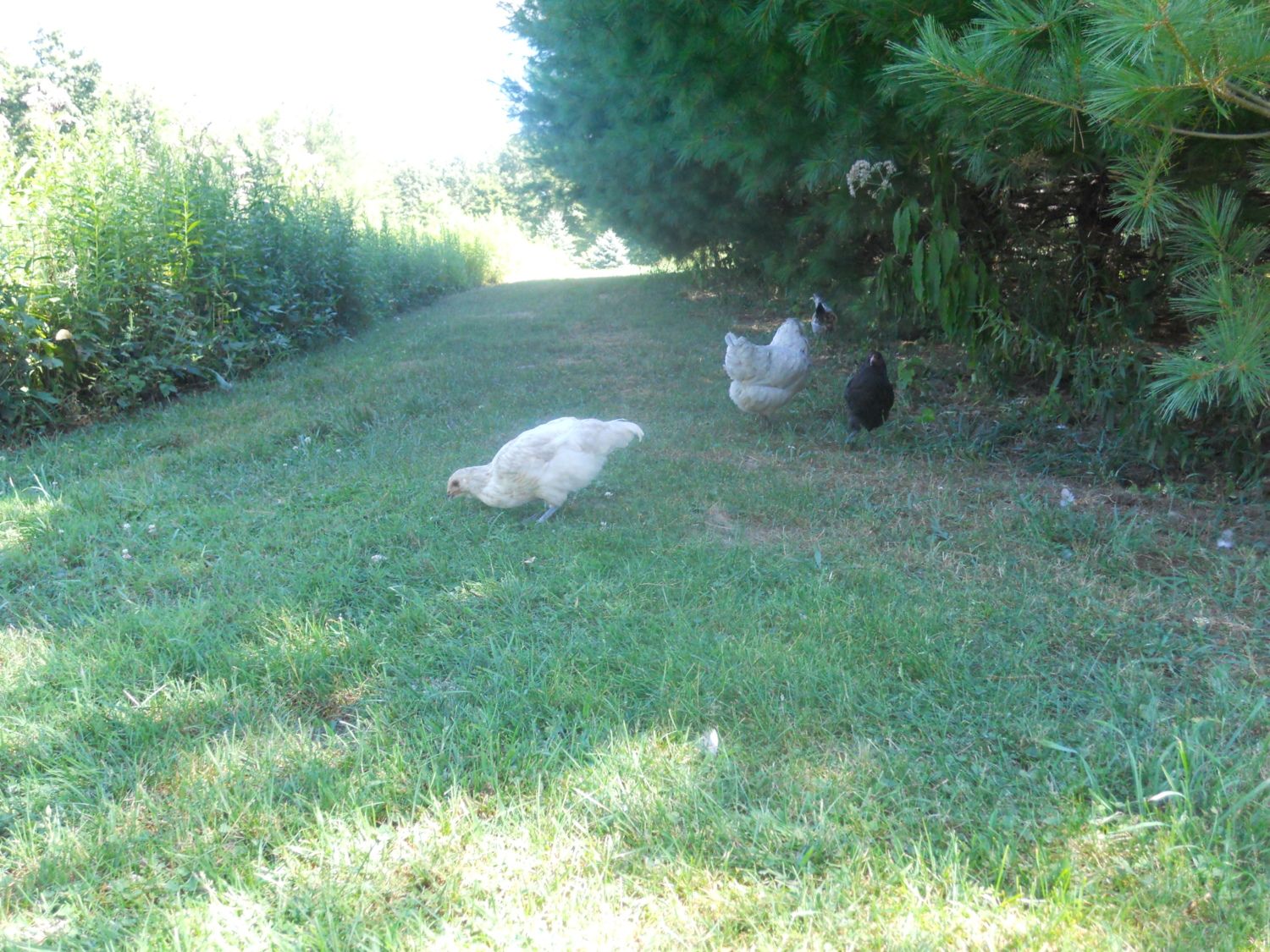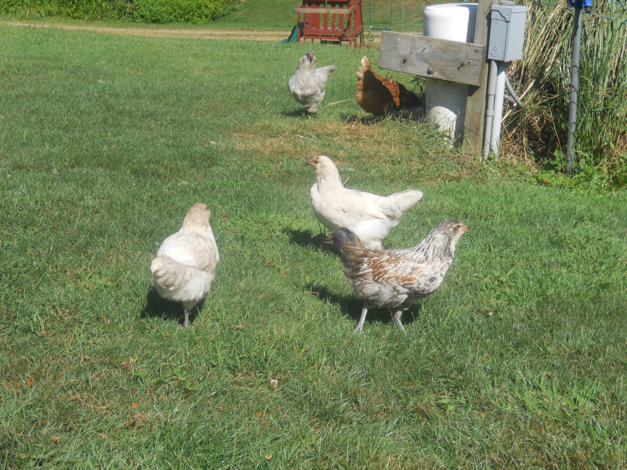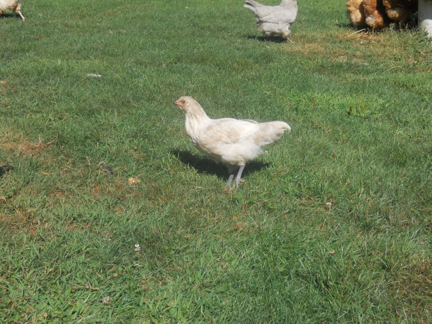 Here's a few more pictures of my Easter Eggers. I'm pretty sure most of them are pullets? I think the white/cream colored ones are pullets? I'm not sure about the variegated one -- I did a separate post on that one with numerous pictures. I have high hopes that it is a pullet, but only due to the coloring I question it. I am pretty sure the black one is a pullet too. Thoughts? None of them have very big combs at all, just tiny pea combs. The rooster to those chicks was a Lavender Ameracauna. The Hens to these chicks were either a Orpington or Red Sex Link.