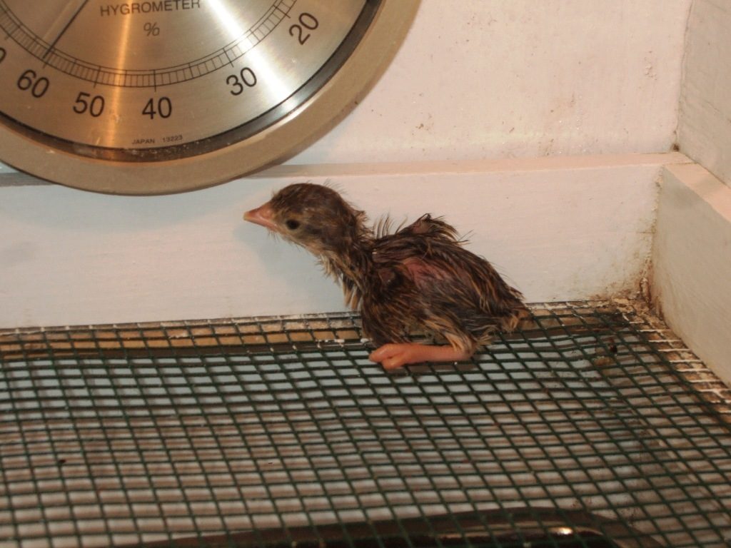Today is day 27 and there has not been any kind of activity going on at all with the other 33 eggs. Since there hadn't been anything happening for the last 2 days and having 7 turkey eggs that needed to go into lockdown today I decided to call this hatch a failure. I cleaned out the hatcher and put the remaining 33 eggs in a plastic bag to throw out. Being curious about whether these eggs had even started to develop, I decided to open a few of them to find out. I opened the first egg and found a fully developed chick that had died. The second egg was a dud. When I opened the third I was suprised to find a chick that was alive. Its yolk sac had not been completely absorbed and was about the size of a pencil eraser. The chick died in a mater of seconds.