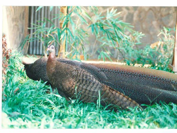 An Eastern Cattle Egret searches for cockroaches as an adult Malaysian Great Argus engages a subadult " Blue Shouldered Bengal" peacock ( peafowl descended of two hybrid parents). Many people don't realise that the Great Argus is a kind of peafowl and that these two seemingly very different birds are each others closest living relatives. Peafowl, including Argus require certain levels of specific amino acids and antioxidants in their diets to produce their impressive plumage and live long, productive lives. Some peafowl, like the Great Argus, fail in captivity largely because of inadequate nutrition. Their mortality far exceeds their reproductive success in most collections.