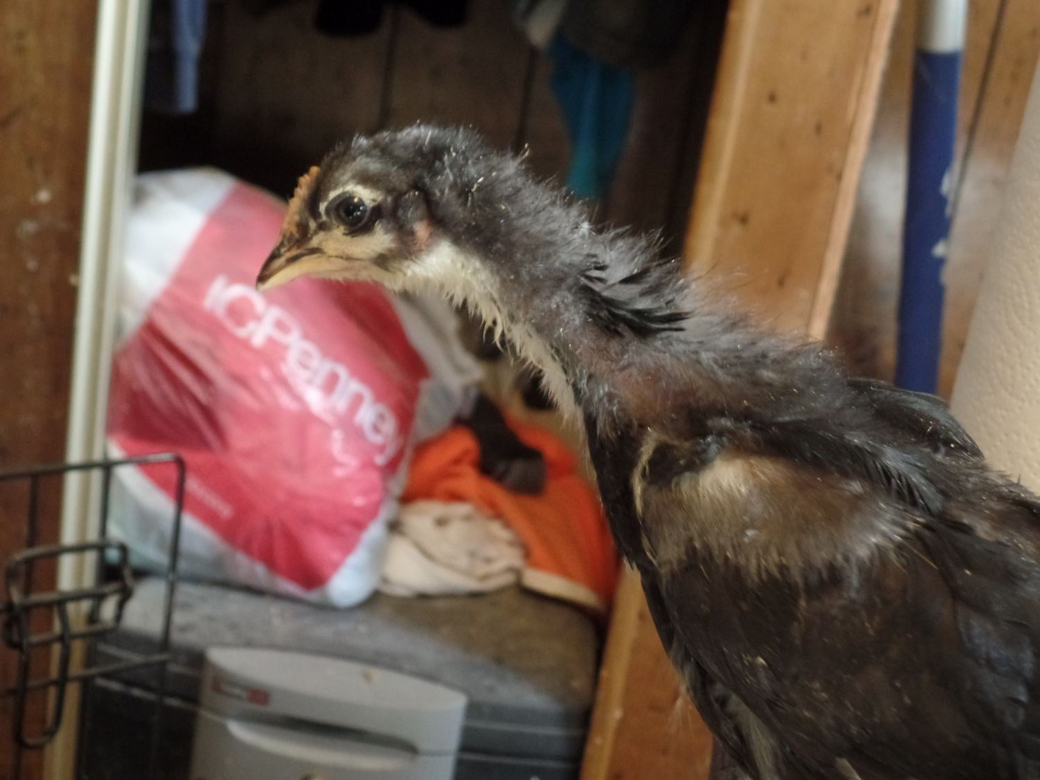 He/she is a 4 week old chick from Ideal's "Surprise Special". He/She is on the large side and is named Stubby due to his/her lack of a tail when all the others have theirs. No feathering on the legs and appears to have a single comb.