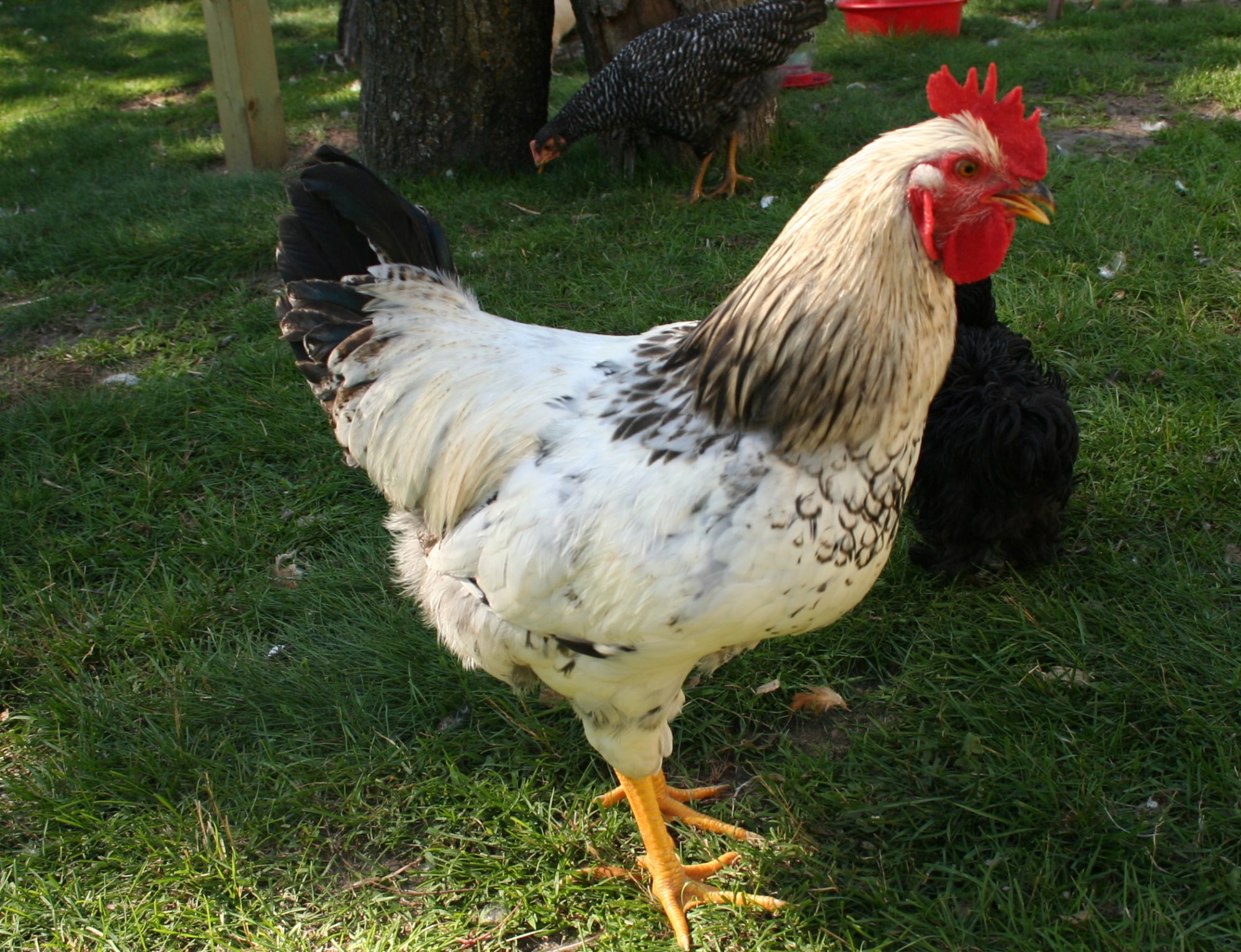 Anyway, I was told he is a Wyandotte. But they don't have the large single comb, right? Not to mention that the coloring is kind of wonky. So he's probably a cross, huh.