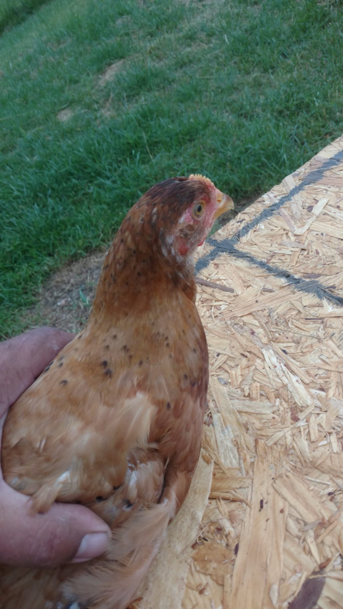 I tried to post this picture last week, but no success, so here she is from the desktop. She came from Rural King, supposedly a "rainbow", that was my first stab at buying chickens. I got 5 leghorns as well that day and this girl is at least twice as big as those mean things. Rainbow as she's known by the kids, is very flighty, I think that was learned from the leghorns.