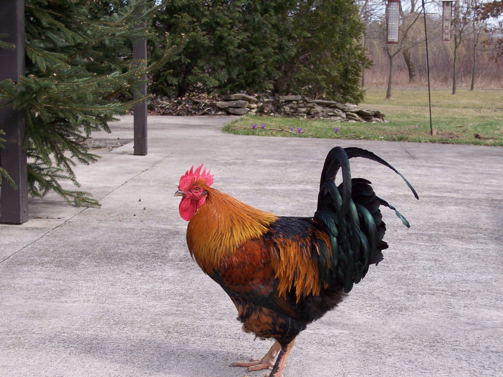 He was acquired from a local school - the kids hatched eggs, admired the chicks, and then had to find homes for them. He found mine. For the first year he was very timid, so we didn't mind watching Fancy Pants Pretty Boy hang out with the hens. But this spring he turned suicidal and started attacking humans. So... he's in the freezer. Not a lot of meat on the bones, but a decent size.