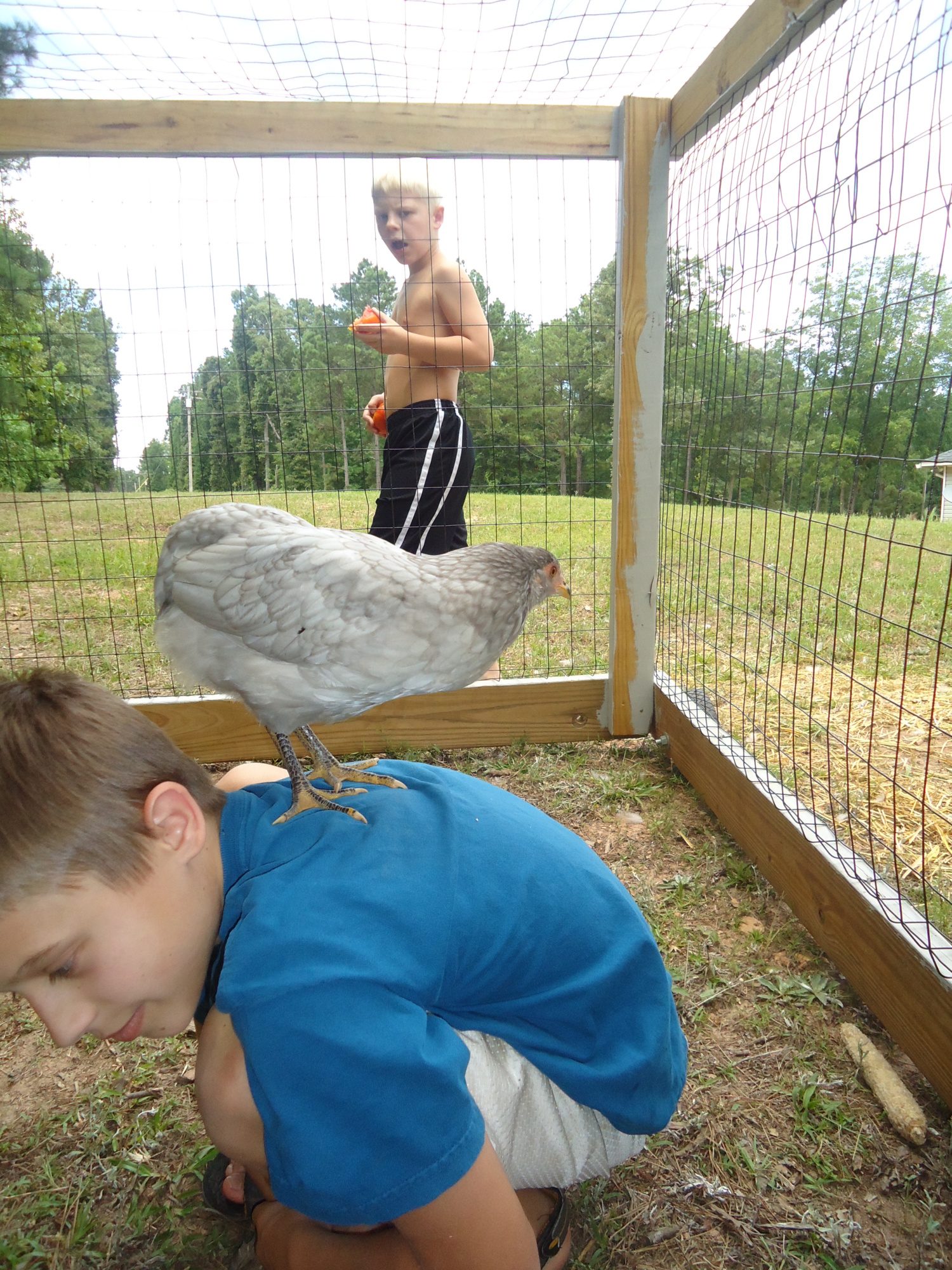 chicken: (to the boy outside the coop) hand over those tomatoes or the boy gets it!
