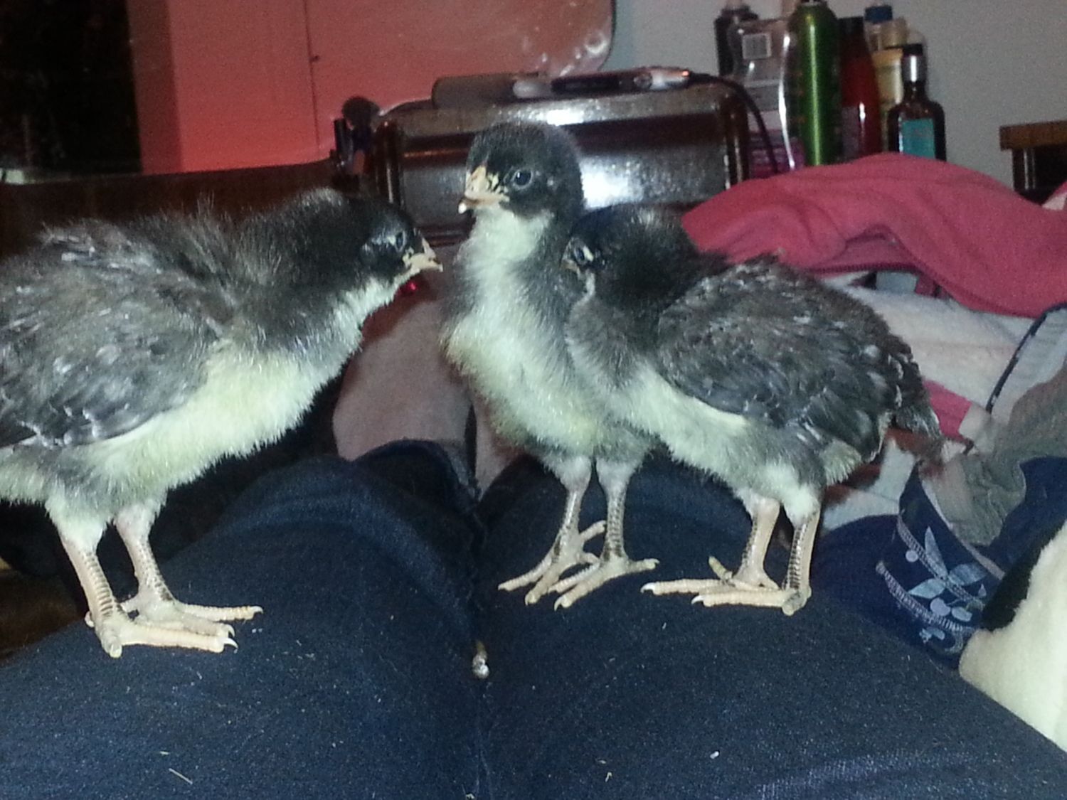 Chick on the right: "I'll pretend to fall asleep. That should keep the human here for a while. Rhonda, that means you are going to let the human pick you up."