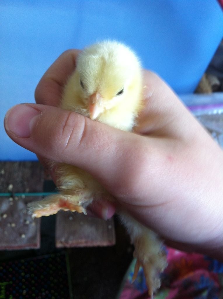 What's she thinking? (BTW: That was taken about a week before she died. Still don't know what from, just found her dead in the brooder one day. I'm pretty sure she was a white frizzle, I know a Cochin for sure. I really wonder how she would have turned out like. I have her sister, who has great confirmation, Champion Feather Leg. All the wonder, I wish she would have made it.).