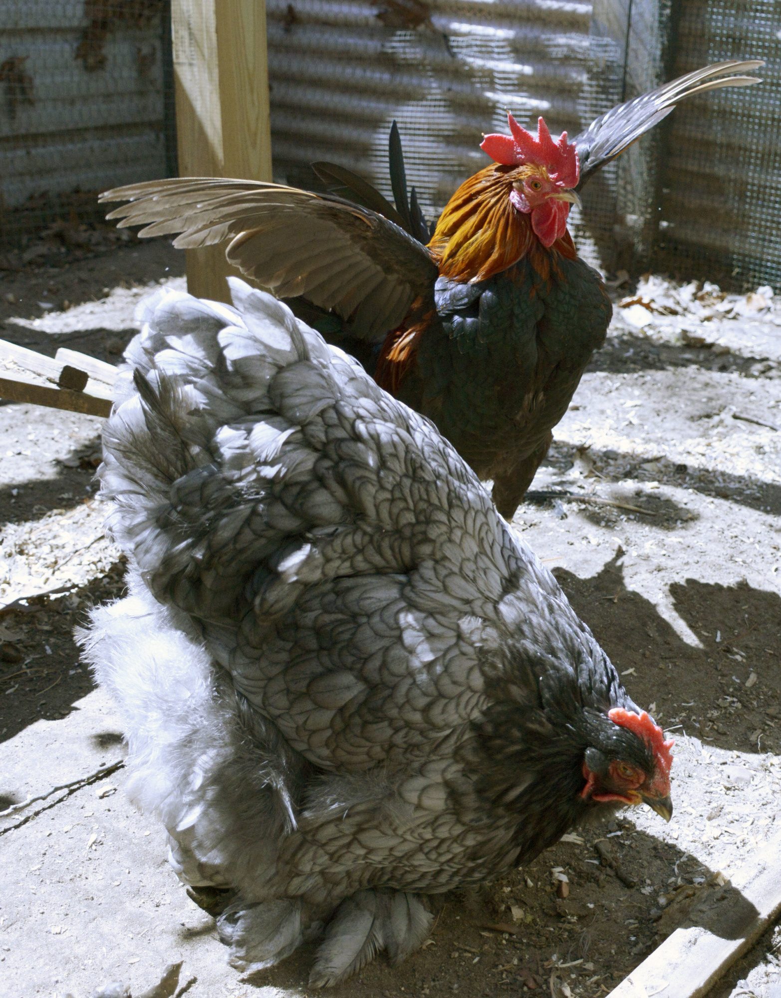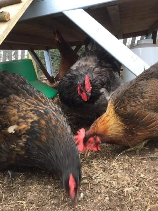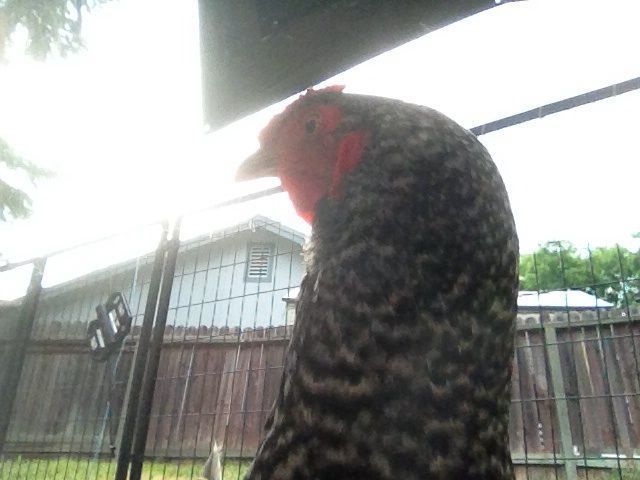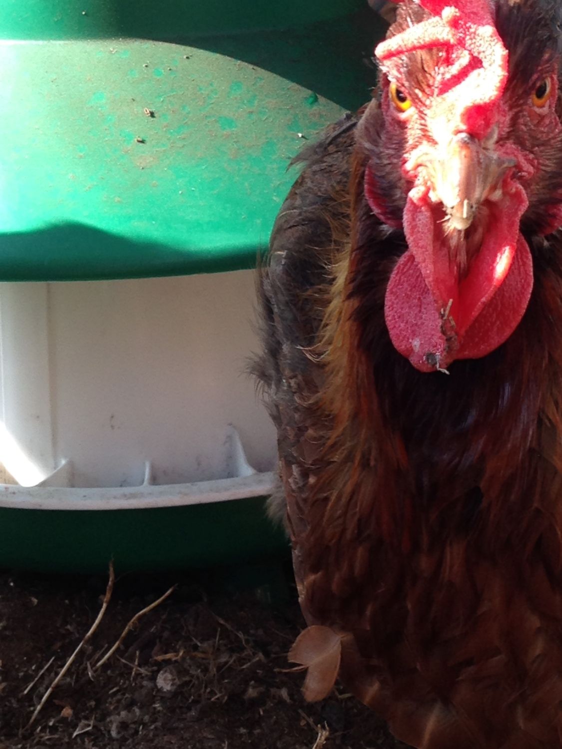 Chickens that are eating: mmmmm, this is good Chicken in the very back: in a second, they will have the egg scared out of them!