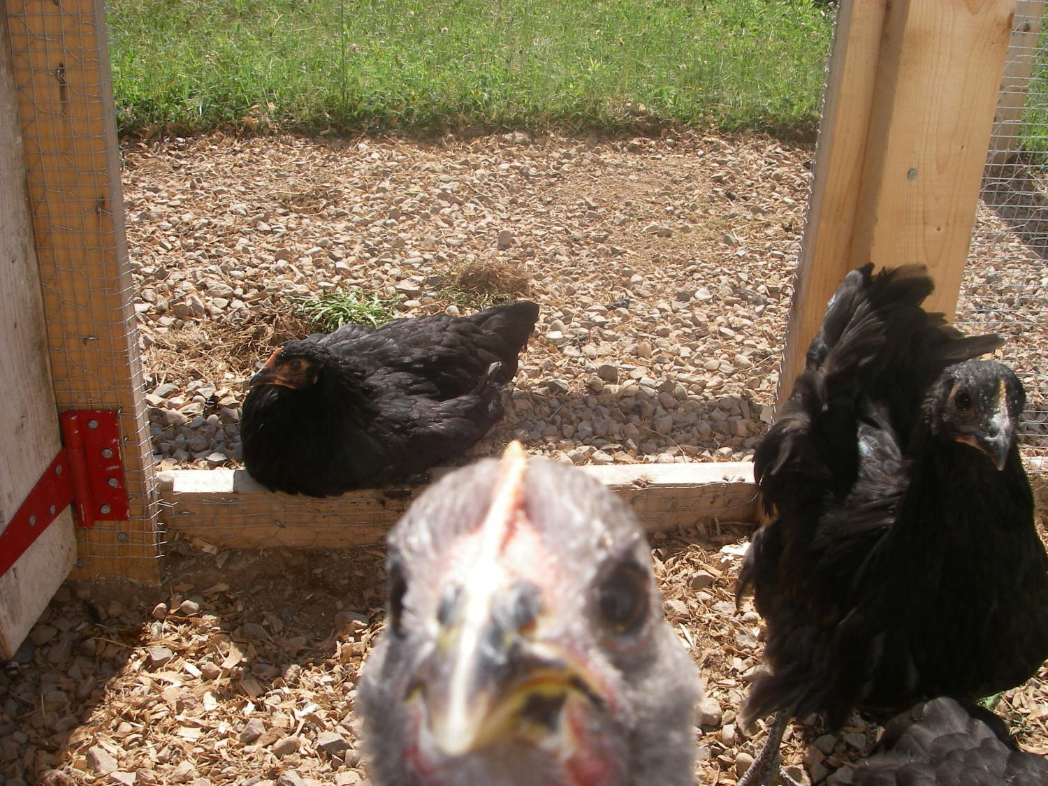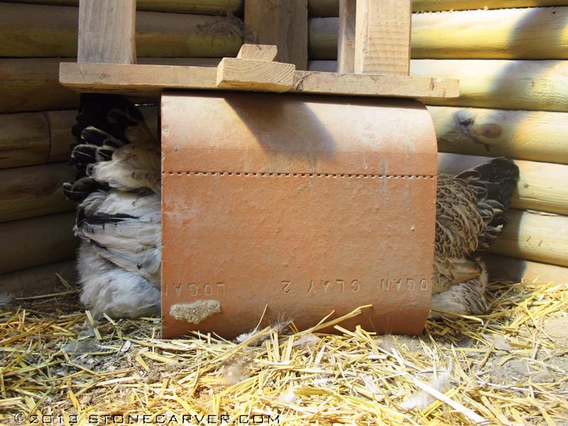 Henrietta in the right is broody. Ursula, on the left, could care less; that's her favorite dust spot.