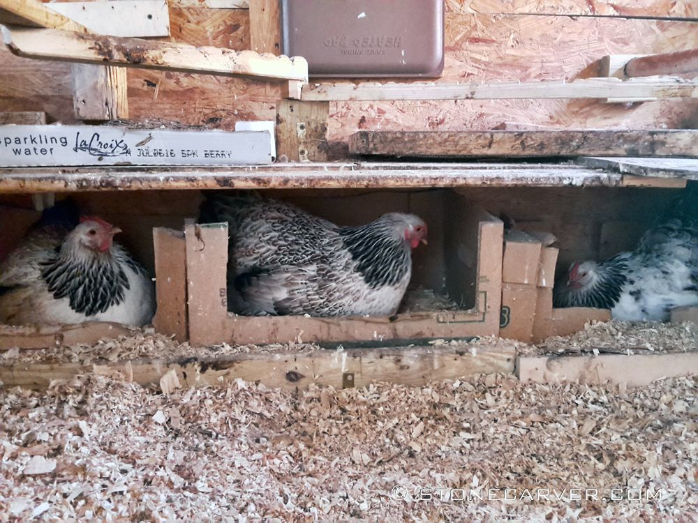 I'm not sure what the chicken is thinking, but the cat is thinking, "MMMMOOOMMMM! Help! The outside came in again!"