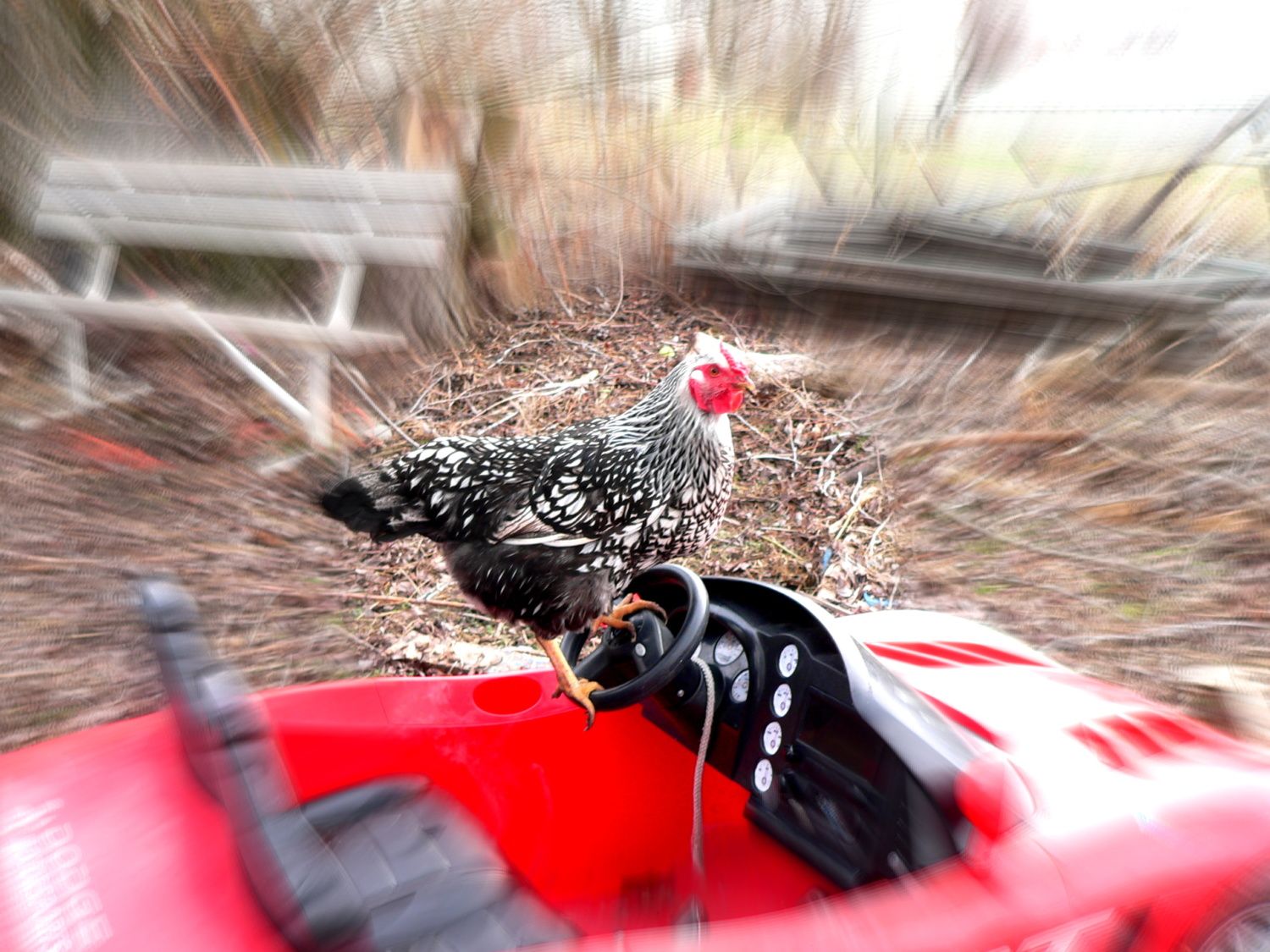 I think I will go cruising for chicks in my shiny red convertible.....Momma is broody!