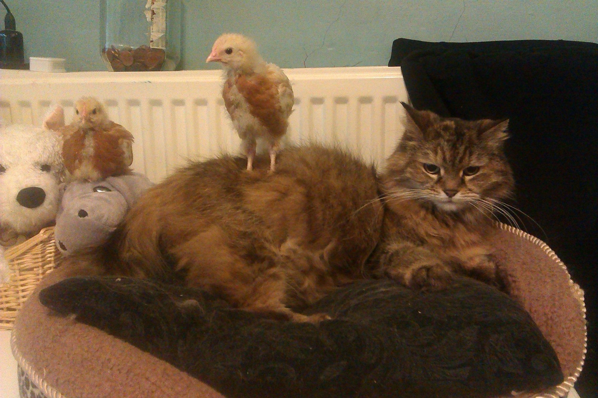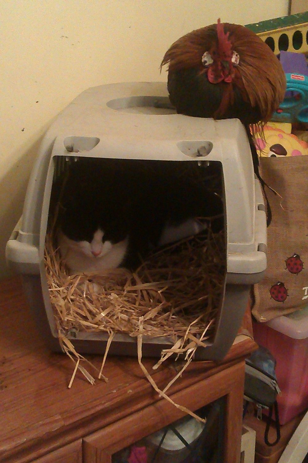 Boy, what is this world coming to...cats sitting in nest boxes going broody, and chickens getting ready to pounce on cats! And I am watching this one!!