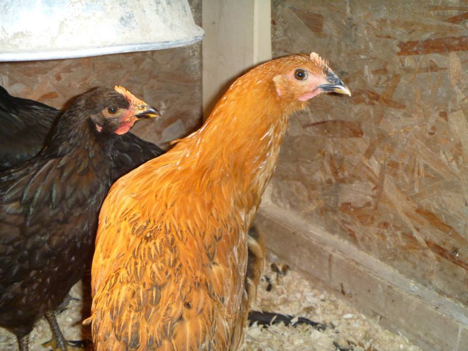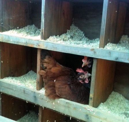 (hen in back) Come on now!...With all the other boxes available and you have to bother me wanting this one?? Now get your fluffy butt out of here!!